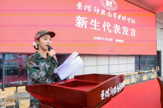 基础教育学院2025级中文3班潘湘怡同学作为新生代表发言。她站在台上,声音带着少年人的清亮与笃定,诉说着迷彩时光的成长,也许下对未来的铿锵承诺。