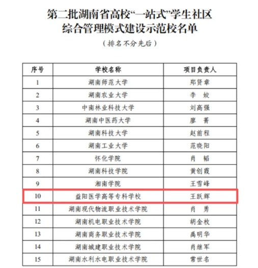 近日,湖南省教育厅公布第二批高校“一站式”学生社区综合管理模式建设示范校及首批特色项目名单,益阳医学高等专科学校获评示范校。这是学校在获评全国高校“一站式”学生社区综合管理模式建设等级A级后,取得的又一重要成果,标志着学校在学生社区建设领域迈上了新台阶。