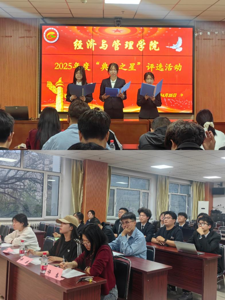 经济与管理学院在逸夫楼南楼301 会议室举“经管学子,榜样力量”2025 年度“典范之星”评选活动。此次活动旨在深入贯彻习近平总书记关于树立榜样、弘扬社会主义核心价值观的重要讲话精神,进一步激励学生争当先进,展现新时代青年风采。