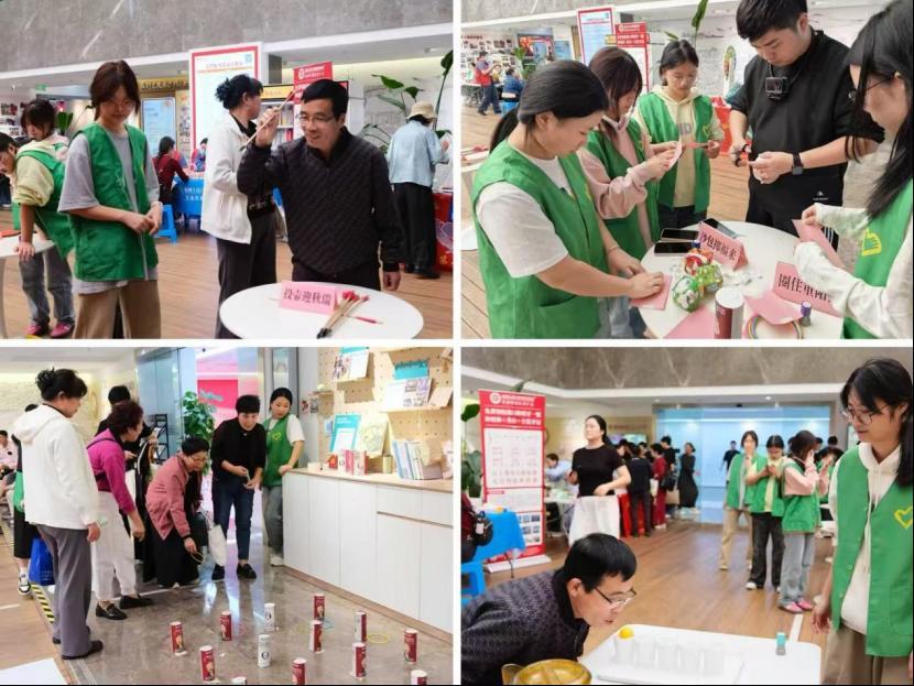 从项目讲解到动作辅助,从情绪带动到细节关怀,志愿者们始终以热情与耐心伴在长者左右,他们的身影穿梭在各个活动点位,用细致服务让长者们沉浸式享受游戏乐趣,也让现场的欢声笑语更显真挚。在“投壶迎秋瑞”区域,志愿者们主动俯身为长者调整站位、讲解投壶技巧,每当羽箭入壶,便第一时间送上掌声与喝彩;“沙包掷福来”游戏中,志愿者提前为长者摆放好投掷线、递上沙包,还会贴心提醒“慢一点、瞄准目标”,看着老人在一抛一掷间展露笑颜,志愿者们也跟着分享这份欢乐,让活动现场更添温情;“圈住重阳福”项目中,志愿者不仅帮行动不便的长者递圈、捡圈,还暖心鼓励长者们,调动氛围,当套中目标时,志愿者与长者的欢呼声交织在一起,热闹非凡。