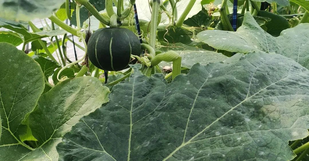 透过大棚的网纱看到生绿色还未完全成熟的南瓜。