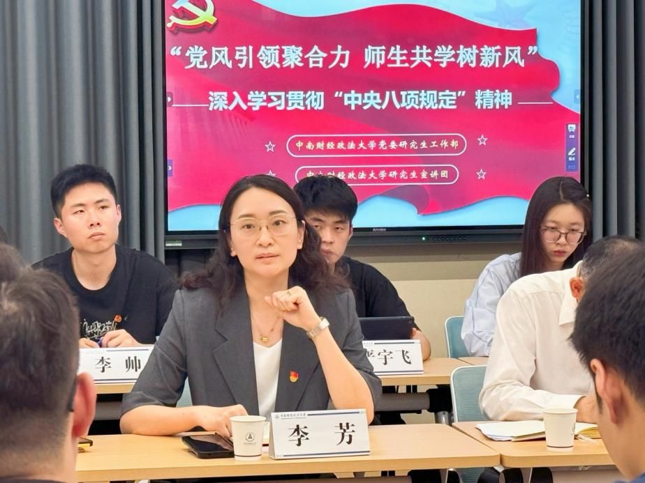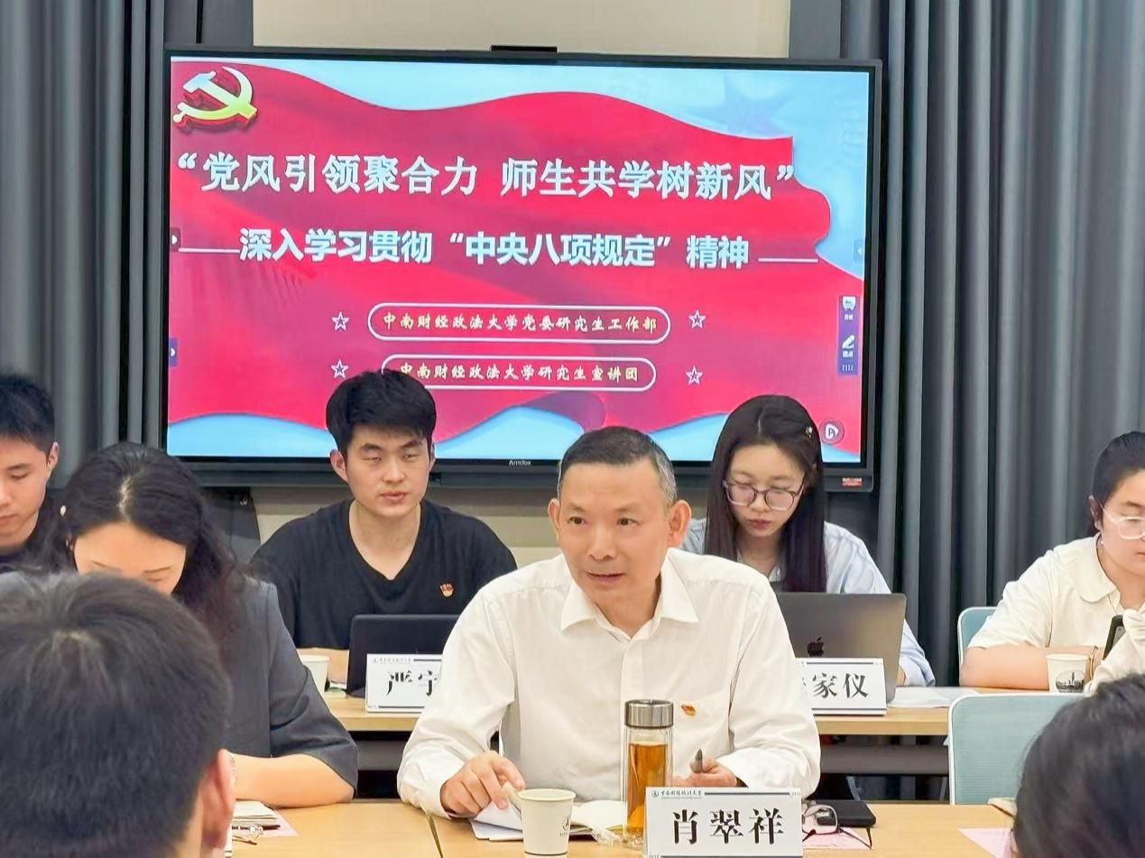 在全校上下开展深入贯彻中央八项规定精神学习教育浓厚氛围中,2025年4月18日,党委研究生工作部于文瀚楼北205室开展“党风引领聚合力 师生共学树新风”——深入学习贯彻“中央八项规定”精神。党委研究生工作部肖翠祥部长、李芳副部长出席,相关科室负责人、研究生宣讲团成员和研究生会党支部成员代表参加会议。