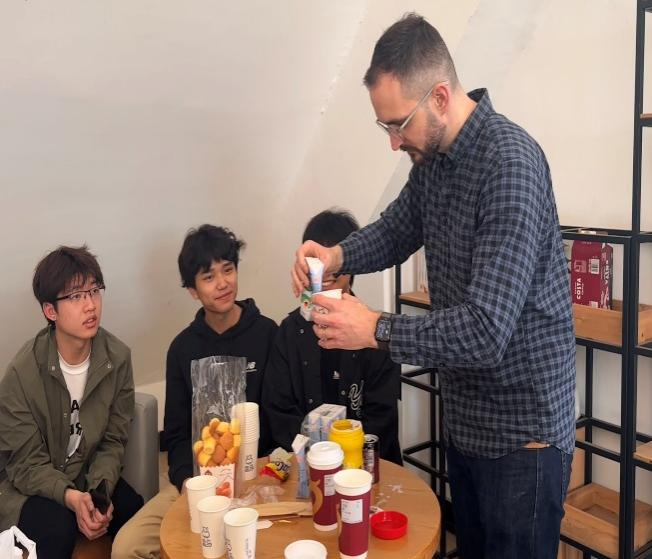 活动现场,Isaac老师化身专业咖啡师,演示拿铁、黑咖啡和浓缩咖啡的制作流程,生动讲解咖啡文化与制作工艺。中式早餐代表油条也随之同台亮相,与西式咖啡的搭配形成有趣对比,带来新奇的味觉体验。师生们在轻松的氛围中品味美食,学习美食在西语中的表达方式,“café expreso”(浓缩咖啡)、“café negro”(黑咖啡)、“latte”(拿铁)、“porrón”(油条,西班牙语中油条的一种常见说法)等西班牙语词汇,一同体验语言与文化的双重魅力。