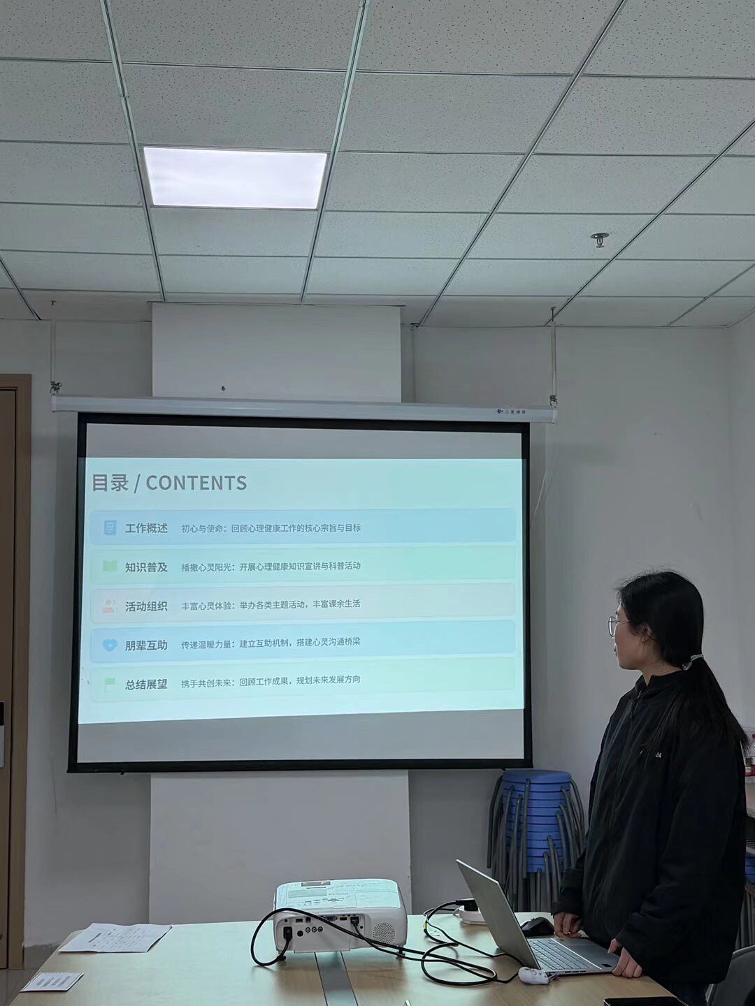 工作成果展示环节中,选手们以PPT为载体,结合自身工作经历,生动分享了班级心理健康宣传、主题班会组织、朋辈谈心谈话、心理困境学生帮扶等实践成果。展示内容详实具体、亮点纷呈,既有常态化工作的扎实推进,也有特色活动的创新探索,充分彰显了我院心理委员认真负责的工作态度、扎实的工作积累以及全心全意为同学服务的初心。
