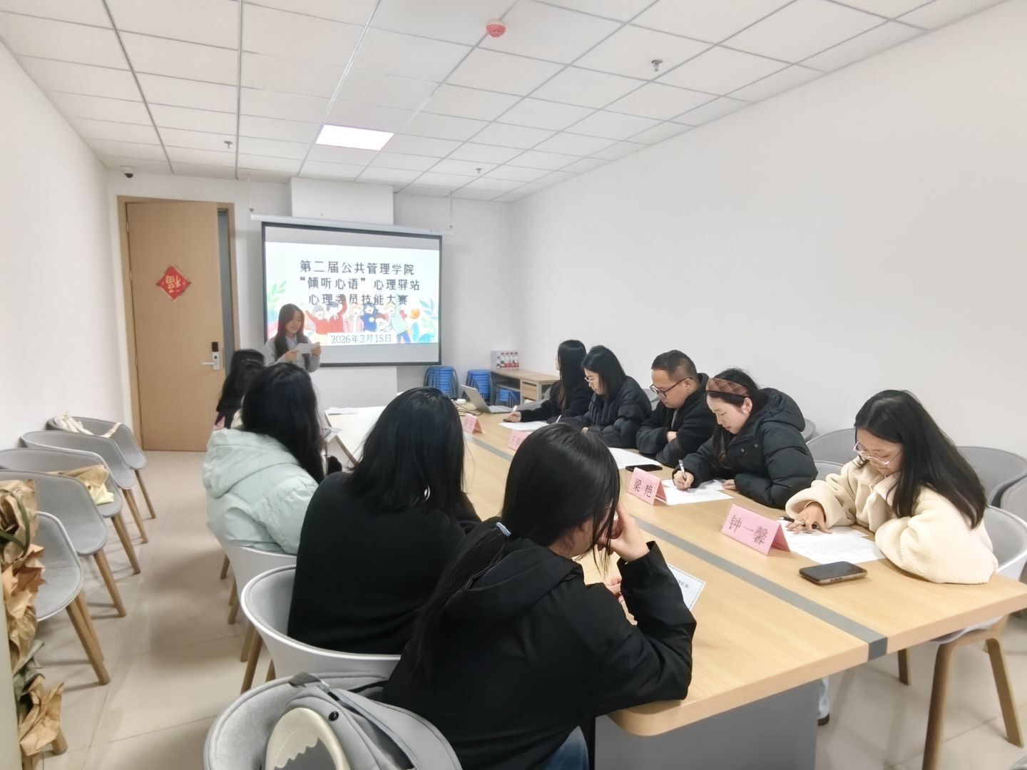 为筑牢校园心理健康防线,提升心理委员专业素养与实操能力,3月18日中午在G1-105顺利举行第二届公共管理学院心理委员技能大赛初赛。本次比赛由学院“倾听心语”心理驿站主办,陈元、王春凤、蒋宇峰、梁艳、钟一馨五位老师担任评委,全院各班心理委员同台竞技、交流经验、共同成长。