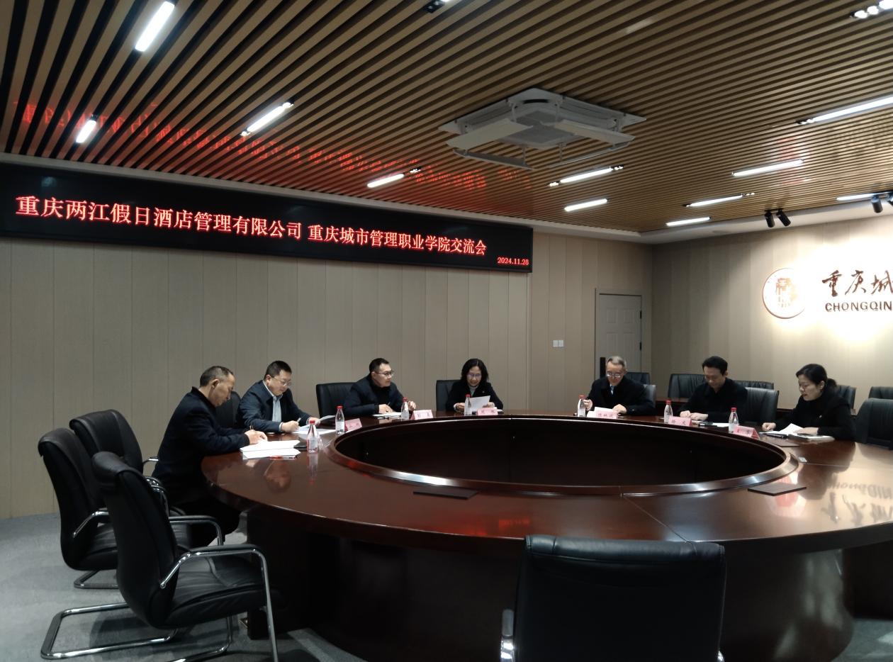 11月28日,重庆两江假日酒店管理有限公司党委副书记、总经理周伟一行四人来我校进行座谈交流。学校党委委员、副校长彭勇,以及产教融合中心、文化与旅游学院负责人参加会议。