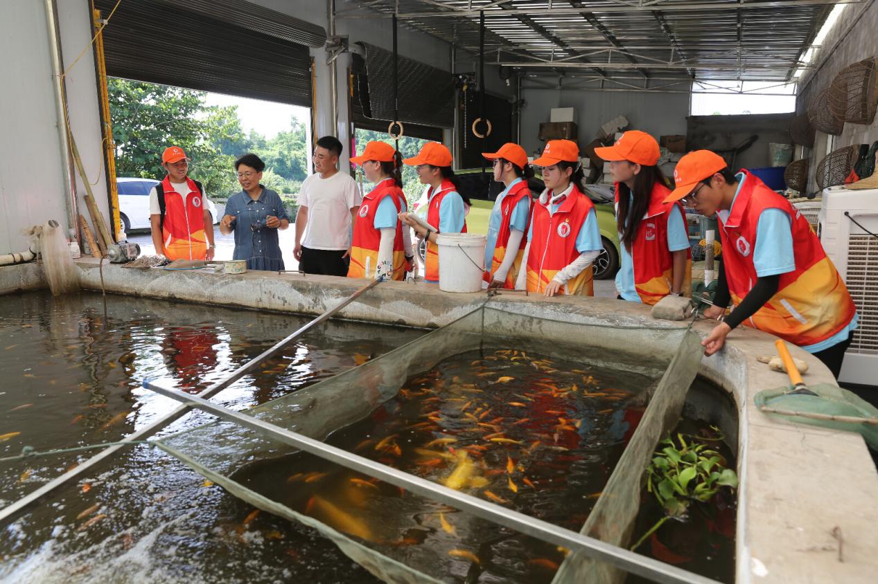 团队深入双河街道鱼苗产业社区,在村委会工作人员刘向强及安玲水产养殖场负责人罗安玲的带领下,实地参观现代化鱼苗养殖场。罗安玲详细介绍了养殖场的经营模式、技术应用及面临的机遇挑战,团队成员围绕“产业振兴如何赋能乡村发展”进行了深入交流与学习。此行深化了青年学子对乡村特色产业现状的认识,切身感受到产业兴旺在乡村振兴中的核心作用。