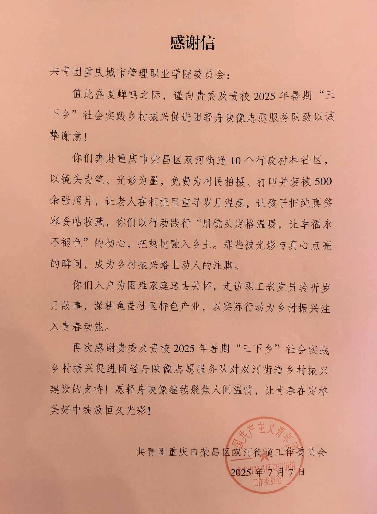 为深入服务乡村振兴,贡献青春力量,7月1日至5日,学校团委乡村振兴促进团轻舟映像志愿服务队深入重庆市荣昌区双河街道,开展为期5天的暑期“三下乡”社会实践活动。活动聚焦民生关怀、产业探访与基层合作,以光影传递温情,以行动助力发展。