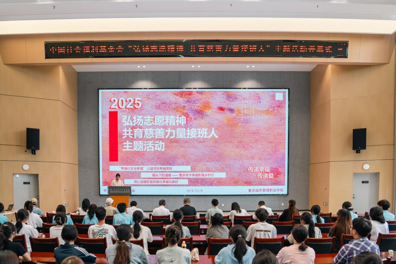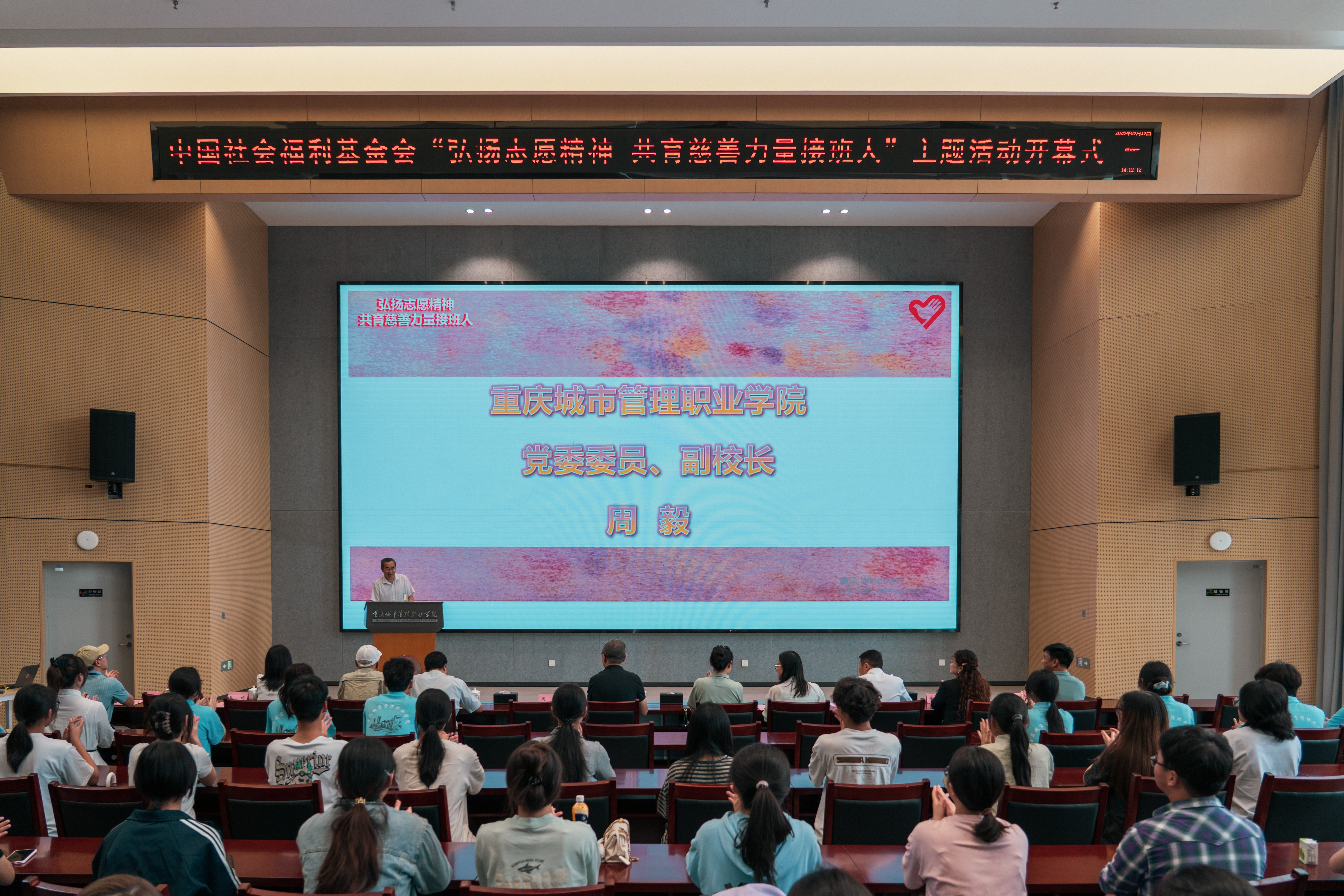 9月19日,我校联合中国社会福利基金会在荣昌校区举办“弘扬志愿精神 共育慈善力量接班人”主题影展活动。中国社会福利基金会公益项目二部主任王伏虎、城乡社区基金会总干事邵晔、重庆十大公益人物冯爽、荣昌区委社会工作部副部长肖建军、共青团荣昌区委书记谢开翠,学校副校长周毅及荣昌校区管委会、校团委相关负责人,校轻舟映像志愿服务队成员和2025级部分新生参加。