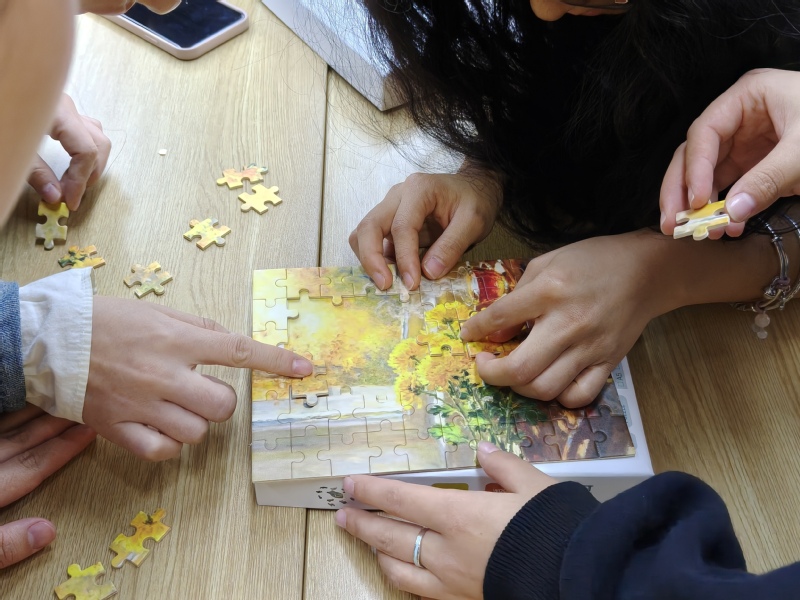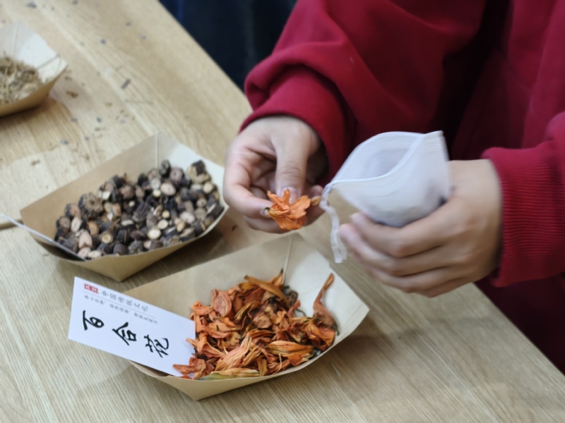 活动以“三巧”为核心设计了“巧拼菊画”、“巧吸福运“巧制香囊”三个趣味环节。在“巧拼菊画”中,四人小组协作拼贴菊花图,既比拼速度与默契,也领略了秋日菊韵;“巧吸福运”接力赛气氛热烈,队员们用吸管传递“福”字卡片,技巧与配合引来阵阵欢笑;“巧制香囊”现场,师生们先识药材、知功效,再亲手称量搭配、填充成囊,淡淡药香萦绕间,一个个包裹着安康祝愿的香囊也悄然成型。