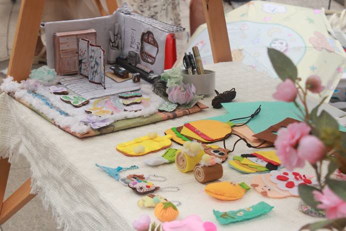 活动期间,集市摊位成为文化与创意的汇聚地。宿舍成员秒变“摊主”,精心布置摊位,将琳琅满目的手工作品整齐摆放,吸引众多同学驻足观赏、选购。同时,全校招募的200名“火力使者”积极为摊位增添人气,现场热闹非凡。在这里,每一件手工作品都是学生创意与智慧的体现,每一次交流互动都传递着宿舍特有的团结协作精神,让宿舍小家在活跃思维的碰撞中焕发出新生力量。
