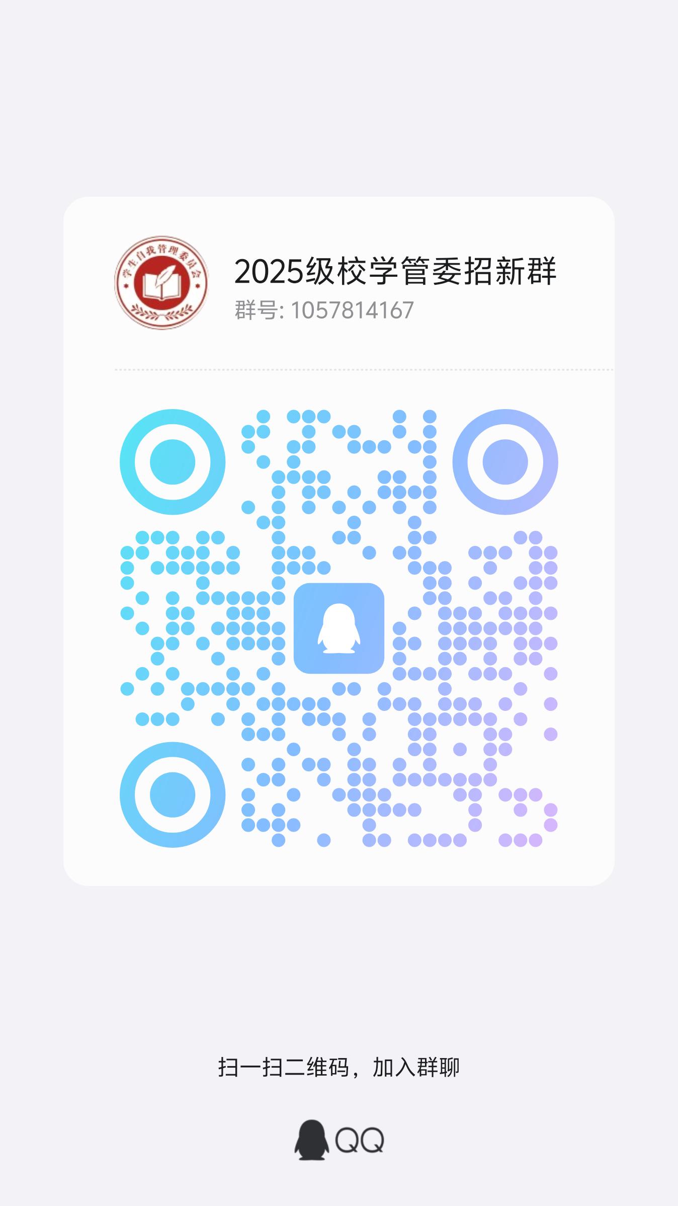 想了解校学管委的具体信息?扫描下方二维码(或搜索群号1057814167)加入【2025级校学管委招新群】,校学管委招新负责人丁同学:(QQ:2390750335)会在线答疑,帮你精准“对号入座”!