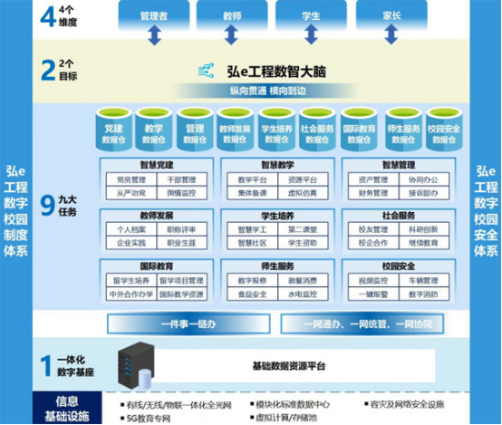 科学编制数字校园整体规划。学校以创建国家职业教育信息化标杆学校为目标,搭建起“1924”数字校园建设框架,涵盖智慧党建、智慧教学、智慧管理、智慧服务等9大板块,并按照“纵向贯通、横向协同”要求,形成9大专题数据仓,探索以数据为核心的数字校园建设新路径。