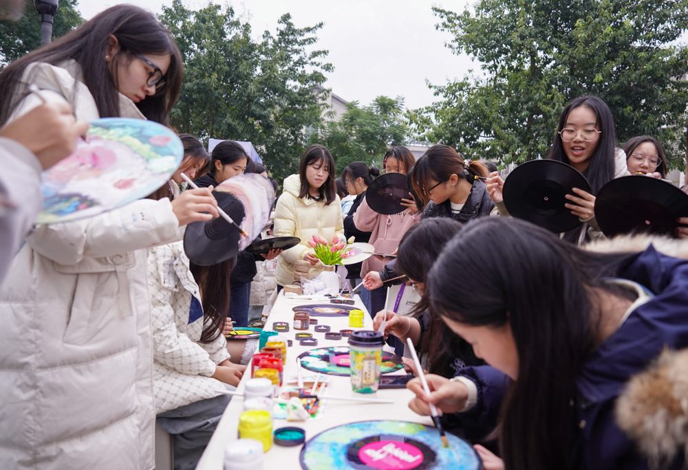 本次活动秉承“体验式成长”的核心理念,精心设置了彩艺手绘和手工制作两大特色主题区域,推出十余项兼具艺术美感和身心体验的活动项目。活动现场气氛热烈,两大特色主题区营造出浓厚的艺术疗愈氛围。在彩艺手绘区,师生通过视觉创作将内心情绪外化表达,在笔墨挥洒间抚平焦虑、释放压力,充分体现了“自我表达”与“情绪可视化”的疗愈理念。手工制作区则通过自然物料构筑和手工制作体验,引导参与者沉浸于创作过程,在涂饰拓印间专注当下、沉淀心灵,感受触觉体验带来的平和与宁静。“活动设计新颖独特,形式丰富多样,不用语言,手绘和手工就能串联起情绪与温暖,这种艺术疗愈的力量,比千言万语都治愈。”物流专业泰国留学生欧若萨说。