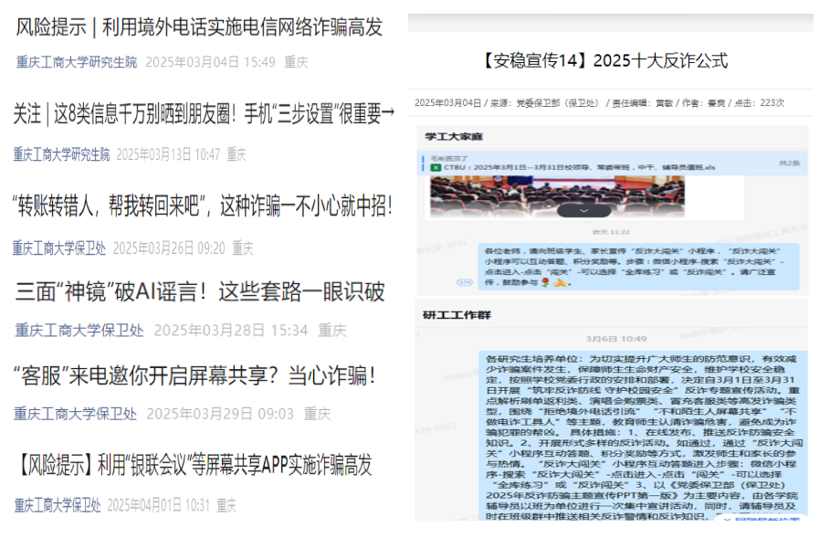 为切实提升师生反诈意识,守护校园财产安全,根据《重庆市教育委员会办公室转发重庆市打击治理电信网络诈骗工作协调机制办公室关于做好开展“筑牢反诈防线 守护校园安全”宣传活动的通知》([2025]-57)要求,2025年3月,学校精心策划并全面开展了反诈宣传教育系列活动,以多元化、全方位的举措为校园反诈工作注入强大动力。