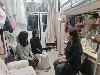 走访过程中,辅导员高丽娜围绕学业发展、生活保障、心理关怀三个方面与同学们进行了亲切交谈。在学业指导环节,针对学业课程难点、四六级备考等问题,辅导员高丽娜结合自身经验给予了具体的指导和建议,并鼓励学生积极面对学业挑战,制定明确的学习目标。生活安全方面重点排查寝室安全隐患,对学生开展安全教育及指导文明寝室建设。在谈心谈话中,辅导员高丽娜还特别关注学生的心理健康状况。针对部分学生因学业压力或生活困扰产生的焦虑情绪,通过耐心倾听和开导,帮助学生缓解心理压力。同时,鼓励学生积极参与校园文化活动,保持积极乐观的心态,勇敢面对生活中的挑战。