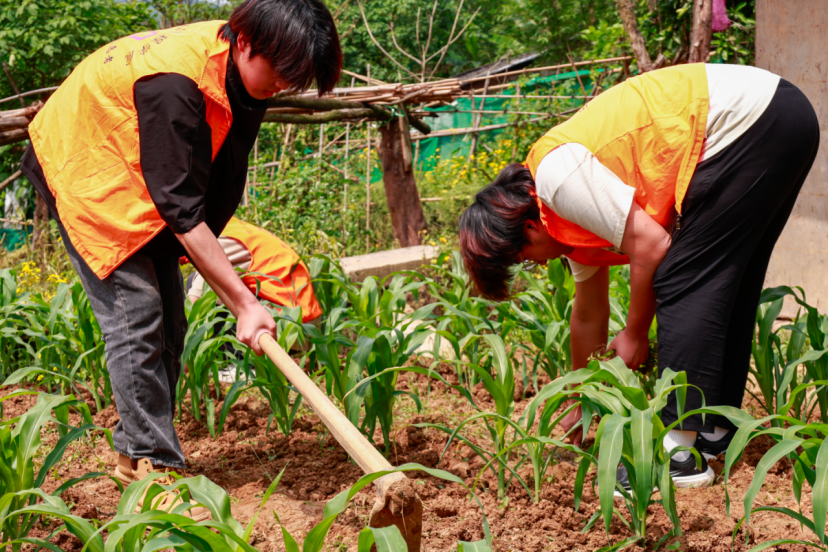 随着时间的推移,炎日打湿了志愿者的衣衫,但丝毫没有打断他们继续劳动的干劲,原本杂草丛生的农田变得整齐干净,同学们还帮助老农们施肥、浇水,农作物在阳光下舒展身姿,焕发出勃勃生机。