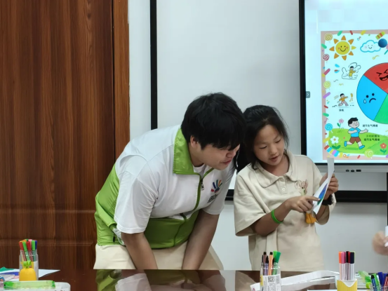 在 “拥抱多彩情绪,做情绪的小主人” 环节,活动伊始,孩子们在 “情绪传声筒” 热身游戏中迅速拉近距离。随后,宣讲团通过知识讲解、“情绪故事会” 接龙和 “绘制情绪蛋糕” 等环节,引导孩子们学会表达和管理情绪,助力他们成为情绪的小主人。