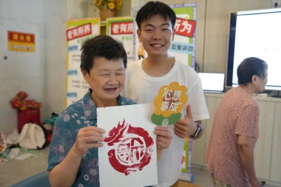 为弘扬中华优秀传统文化,志愿者们准备了“拓印”体验活动,先向老人们讲解拓印的历史渊源与技艺精髓,并亲自示范展示,然后陪伴和指导老人们操作。从选择纹样、调色上色到覆纸拓印,爷爷奶奶们专注投入,在宣纸上创作出清晰的图案或文字。一张张由老人亲手完成的拓片,不仅承载着古老的非遗技艺,也让老人们收获了“作品”,是非遗文化在银龄中的活态传承。