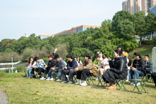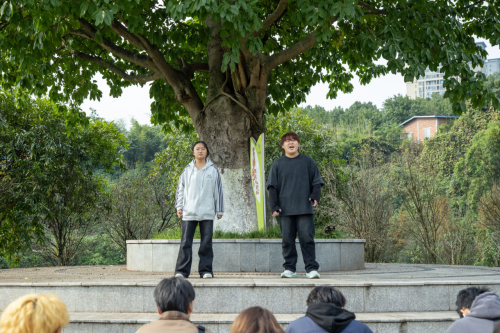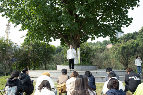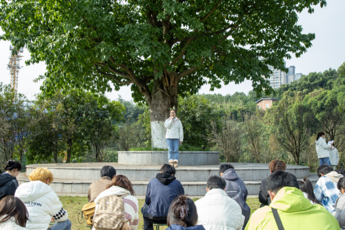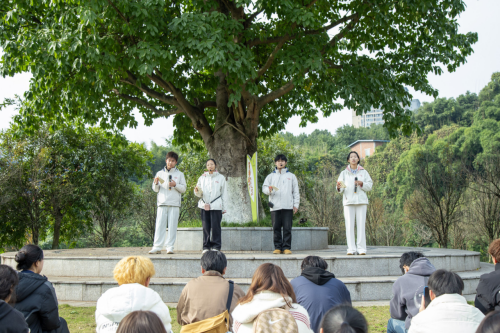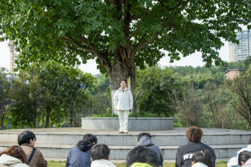 11月26日中午,学生宣讲团成员在合川校区乾坤湖畔黄桷树下党史故事会实践基地,以一场别开生面的微宣讲活动,生动解读党的二十届四中全会精神。