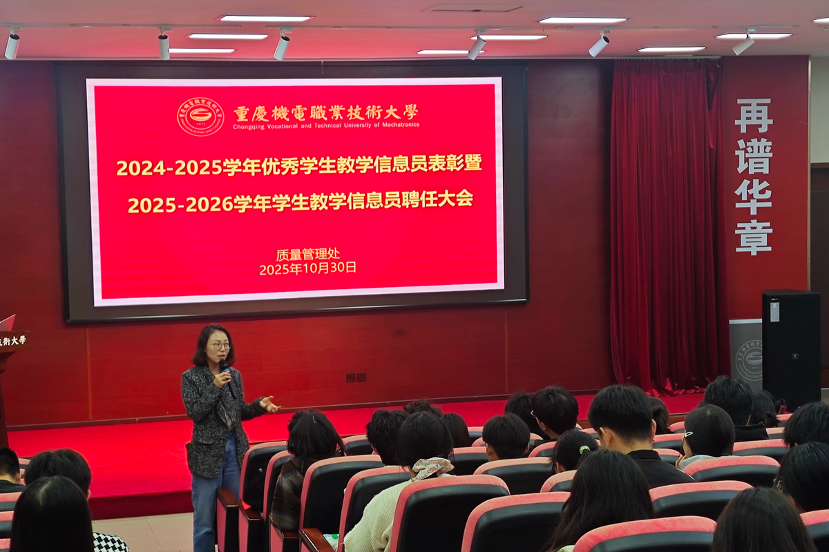 为表彰工作表现突出的学生教学信息员,调动学生信息员参与教学管理的积极性,落实学校《重庆机电职业技术大学学生教学信息员管理办法(试行)》文件精神,质量管理处于10月30日在F219学术报告厅组织召开了“2024-2025学年优秀学生教学信息员表彰暨2025-2026学年学生教学信息员聘任大会”。常务副校长徐益、教务处处长张利国、学生处处长田峰及各学院领导出席会议。质量管理处副处长魏立群主持会议。