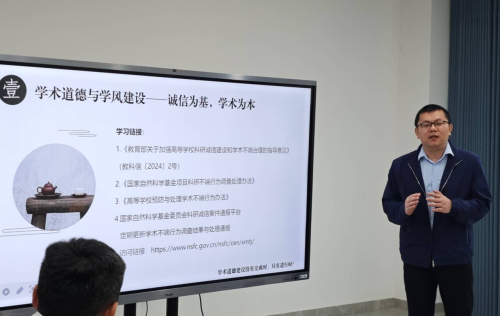 本周恰逢全国第26个知识产权周,为深入贯彻落实国家创新驱动发展战略,提升科研人员知识产权保护意识,加强学术道德建设,张续光在讲座开始前系统领学了科研诚信建设相关文件,同步宣贯“知识产权与人工智能”主题活动,为培育高价值专利、防范学术不端行为提供政策引导。