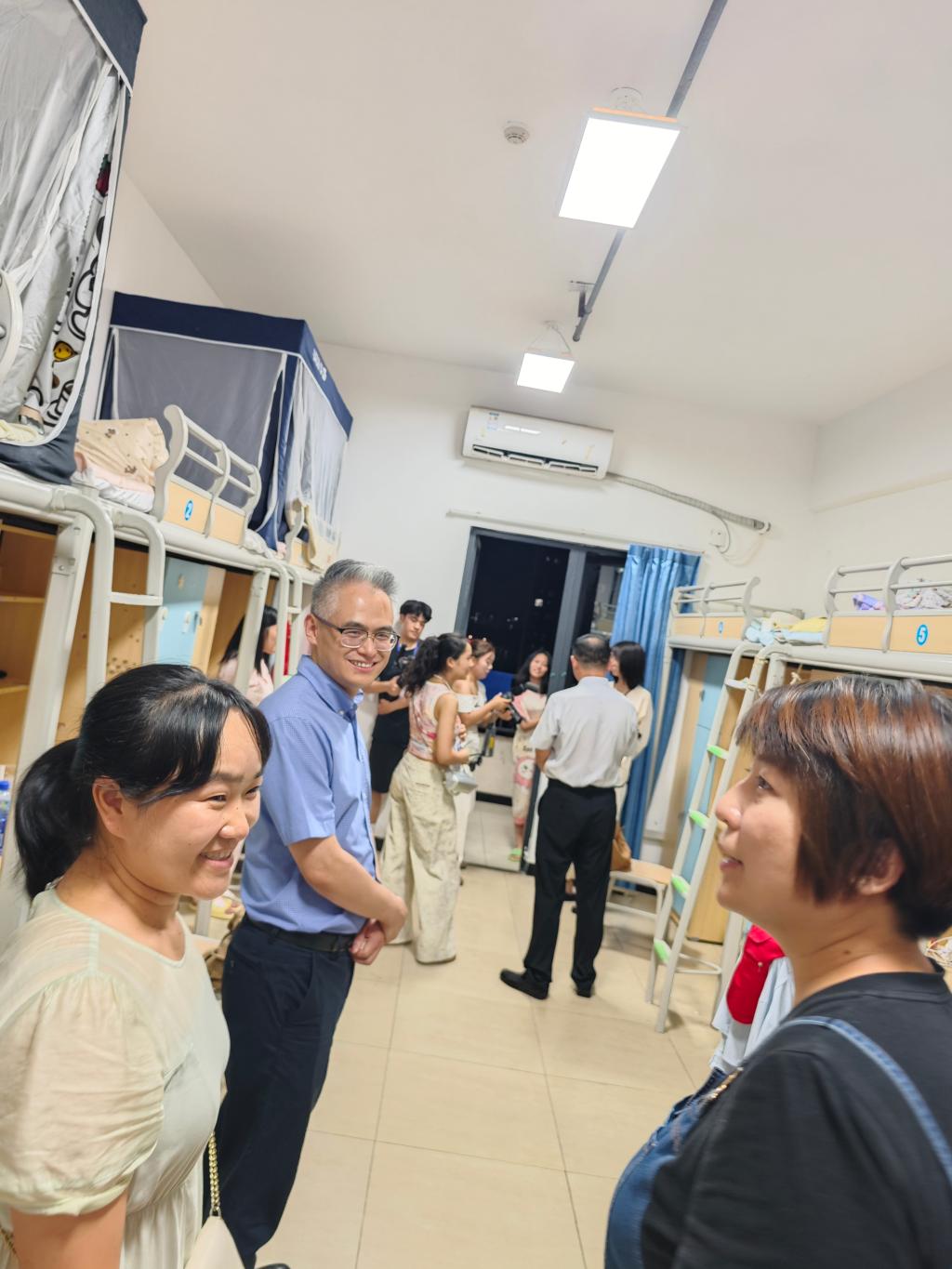 “同学们从哪里来?”“报到过程还顺利吗?”“食堂的饭菜还合口味吗?”“生活上还有什么困难?”每走进一间宿舍,张校、李校都与新生们进行亲切交谈,细致地询问同学们的生源地、入学感受、专业选择以及对校园环境的适应情况,耐心倾听同学们初入大学的所思所感,并现场解答同学们关于学业规划、校园生活等方面的疑问。在A、C、E栋宿舍和高层公寓楼,张校与来自五湖四海的同学们围在一起,亲切话家常。他勉励同学们要尽快完成角色转变,适应大学的学习和生活节奏,珍惜宝贵的大学时光,做好学业规划,打牢专业基础,同时也要注重全面发展,积极参与校园文化活动和社会实践,提升综合素养。他特别叮嘱同学们要互相关心、互相帮助,建立深厚的同窗情谊,共同营造团结友爱、积极向上的宿舍氛围,并与同学们互加微信好友。