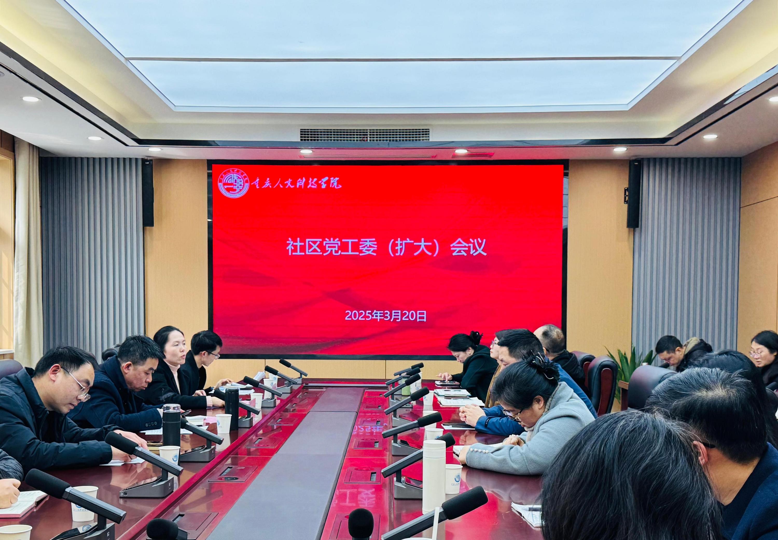 2025年3月20日,学校在怀远楼一会议室召开社区党工委(扩大)会议。校党委副书记舒卫华,校长助理、学生处处长吴静,社区党工委、管委会成员单位负责人及学生处相关人员参加会议。会议由吴静主持。