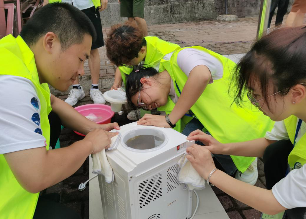 公寓管理中心党员老师和学生宿舍管理委员会的学生党员走进社区传播安全知识,解决实际困难,清洗饮水机