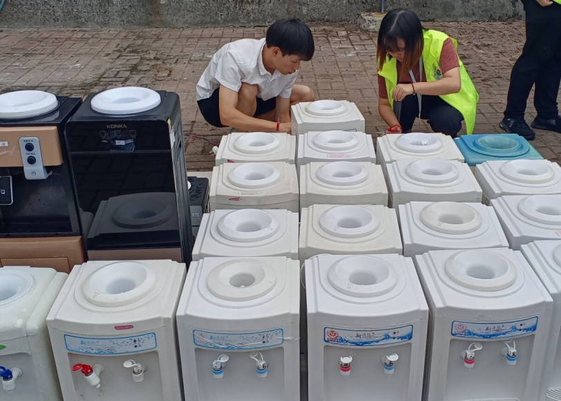 活动现场,饮水机清洗登记、检测、贴标、清洗、消毒、发放,一项项步骤有条不紊。