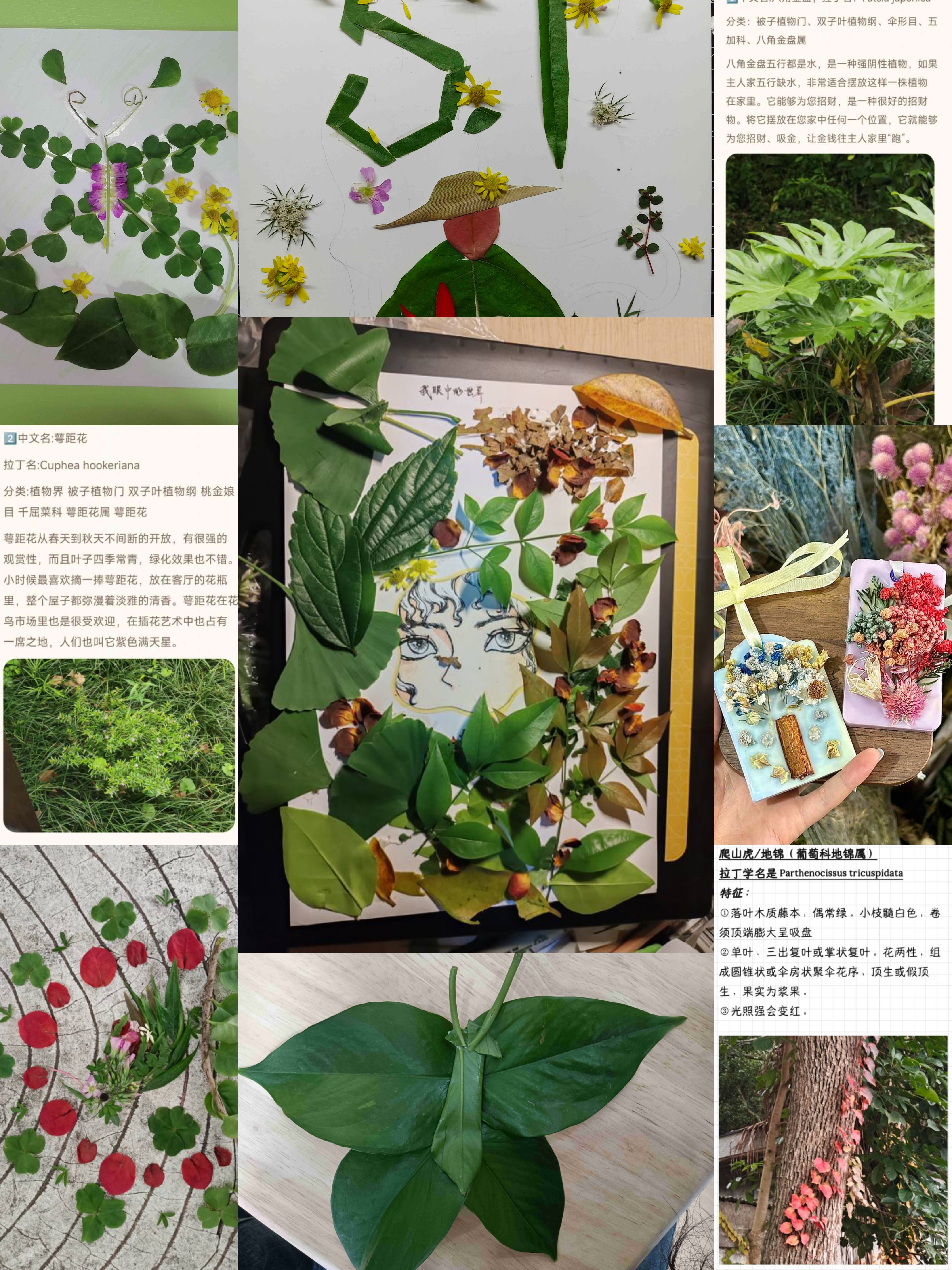 活动以“绿植疗心,在自然呼吸中倾听心灵的声音”为主题,设置了植物冥想、植物拓染、植物拼贴画和插花与花道四大创意活动形式。在植物冥想环节,同学们穿梭于校园角落,拍摄六种植物并记录其中文名、拉丁名及生态价值;植物拓染则通过锤打花叶,将天然色素印染于布料,留存生命的痕迹;植物拼贴画鼓励参与者用落叶、花瓣等材料创作情感主题作品;而插花与花道则通过花材搭配,探索生命与空间的平衡哲思。