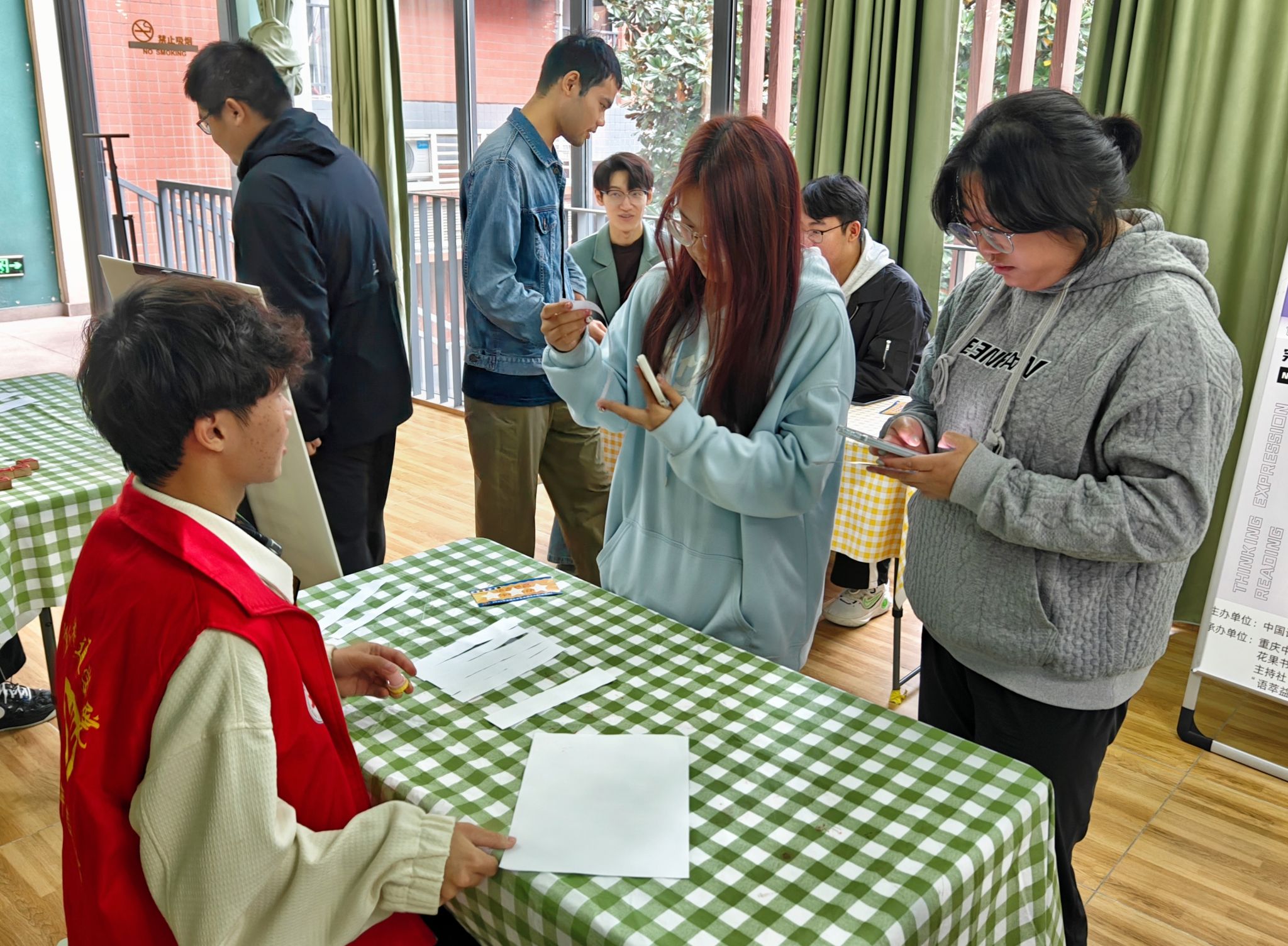 为推进实施“经典阅读写作计划”“大咖传记阅读计划”双线并行的“校园经典阅读写作工程”,进一步加强书院社区学风建设与养成教育,在重庆中华传统文化研究会全民阅读工作委员会指导下,花果书院联合主持社、“语萃益行”志愿服务专项支队于11月5日15:00于202多功能活动室开展“‘语’见‘书’适圈”语言感召体验活动暨2025年全国大学生普通话大赛(移通站)推广活动,以此提高移通学子普通话水平,全面提升同学们的人文素养与综合能力,营造书香校园氛围。
