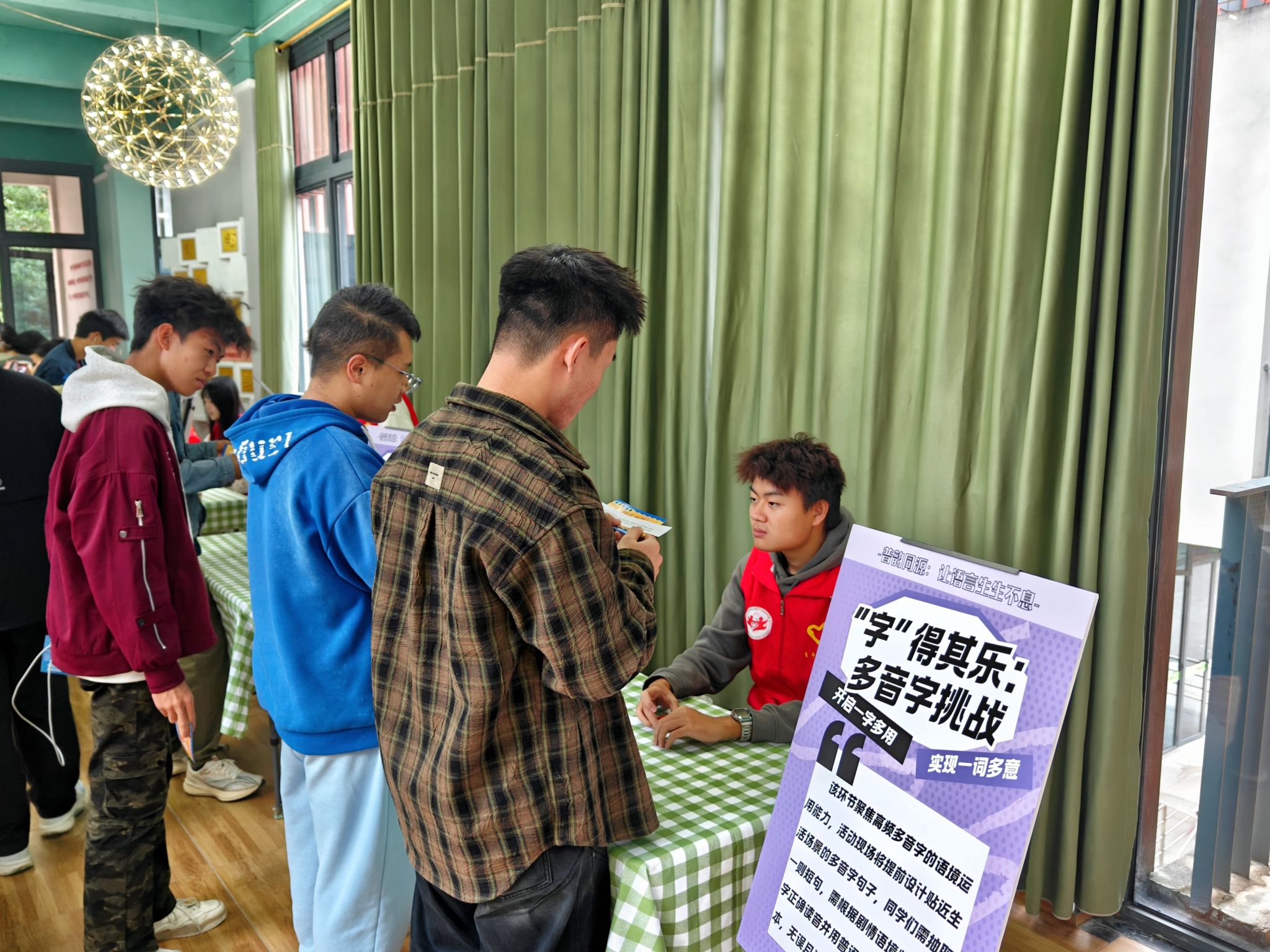 普韵同源,让语言生生不息;自信表达,让青春灼灼其华。活动现场邀请同学们一同话方言、共读普通话,以此增强学生对不同地域文化的理解,同时强化其民族意识;一字多音,藏着汉语的灵动韵律;一音一义,承载文化的深厚底蕴。本次活动以趣味化的方式引导同学们分析语境、拆解文字,让其在多音字长句挑战中解锁语言密码,读懂汉字“形随义变、音因境异”的独特魅力。