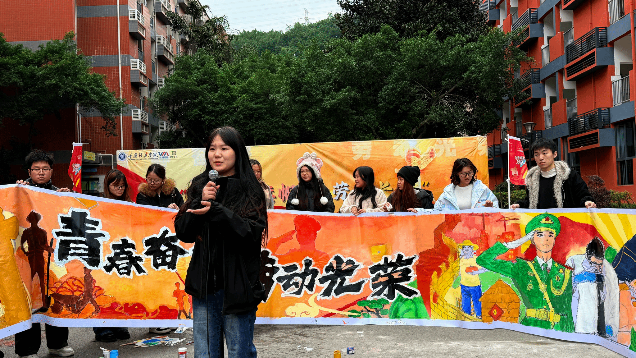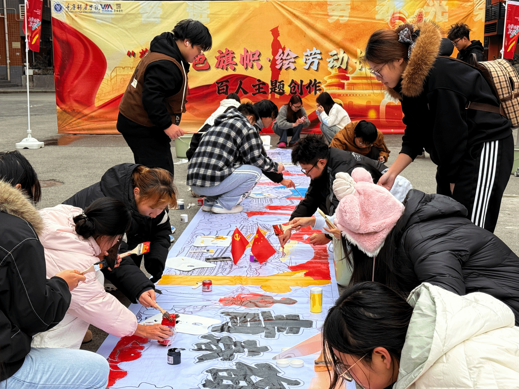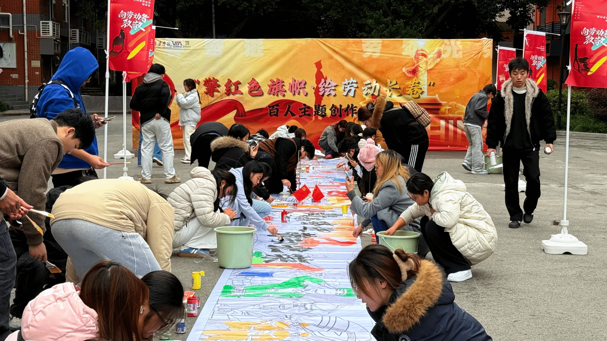 “蘸取红色颜料,勾勒革命岁月烽火。挥动青春画笔,描绘新时代科技华章!”11月18日下午,别都书院劳动教育广场上,百人齐聚,彩笔齐挥,用一幅跨越百年的20米巨幅长卷,生动展现了“劳动创造美好生活”的进程,用一场超“红”的集体创作,解锁了劳动教育的新体验,奏响了一曲“劳动+红色”的青春育人交响曲。