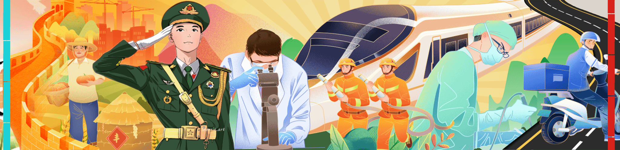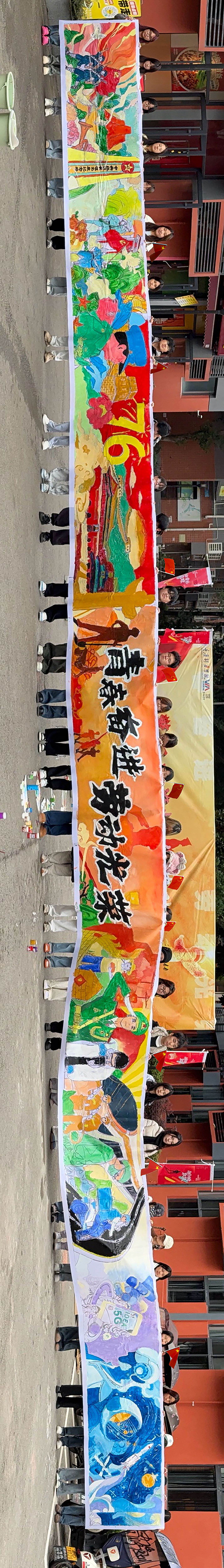 画卷内容跨越时空,宛如一部生动的历史教科书。从艰苦卓绝的革命岁月,那烽火连天中革命先辈们“自己动手,丰衣足食”的坚韧身影;到新中国成立时的欢腾场景,全国上下洋溢着喜悦与自豪;再到各行各业蓬勃兴起、科技日新月异的当代图景,高铁飞驰、5G畅联、航天筑梦……生动再现了中华民族从站起来、富起来到强起来的伟大历程。每一笔、每一划都凝聚着师生们对历史的敬畏和对未来的憧憬。