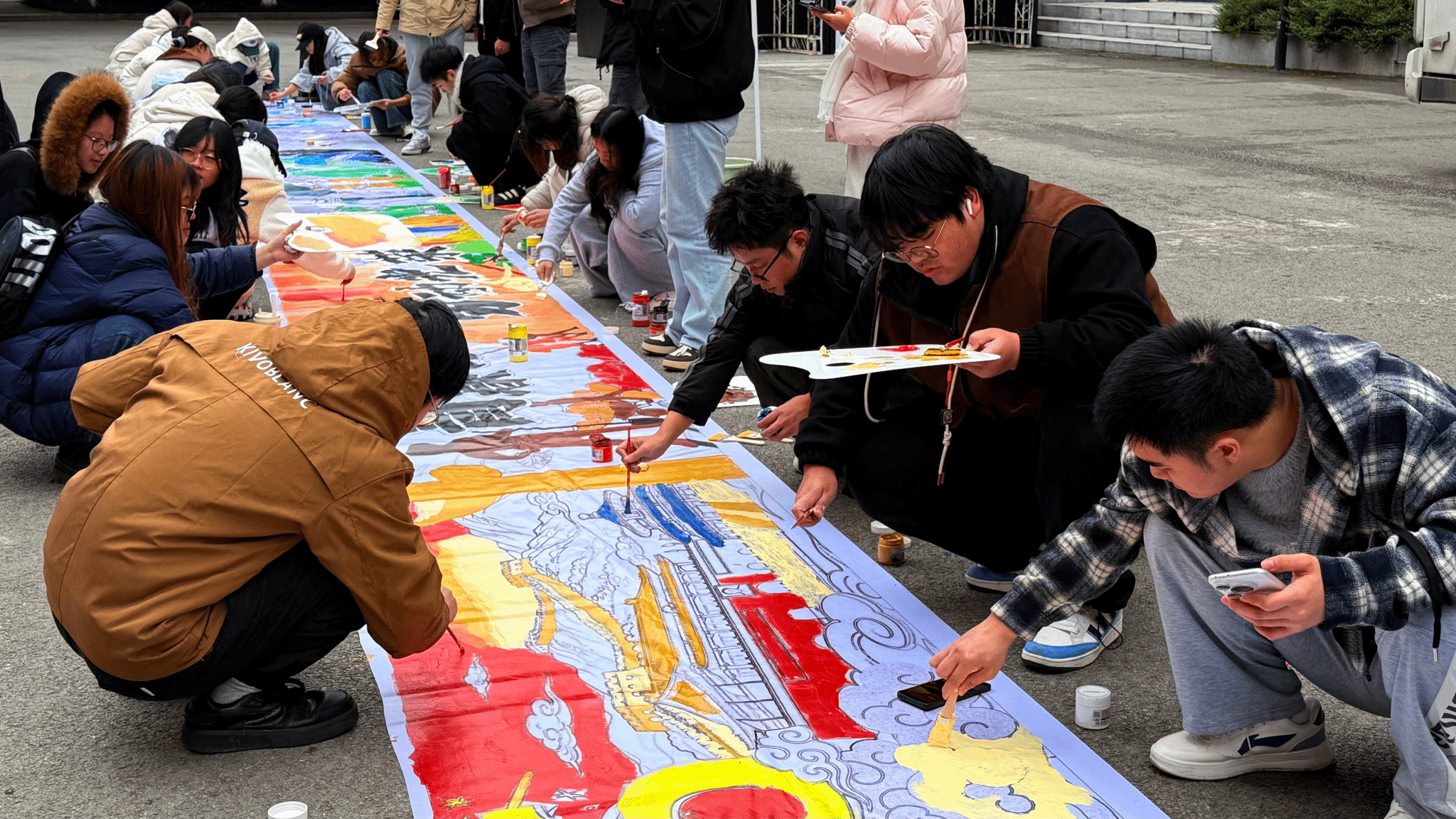 现场,同学们分工明确、默契配合。你勾勒轮廓,精准把握历史场景的框架;我填充色彩,为画面增添生机与活力;他点缀细节,让每一个元素都栩栩如生。“快来帮帮我,这个红旗的颜色不够正!”“这里的华表柱我来画!”大家互相学习、彼此鼓励,在共同创作中增进了友谊,提升了团队协作能力。