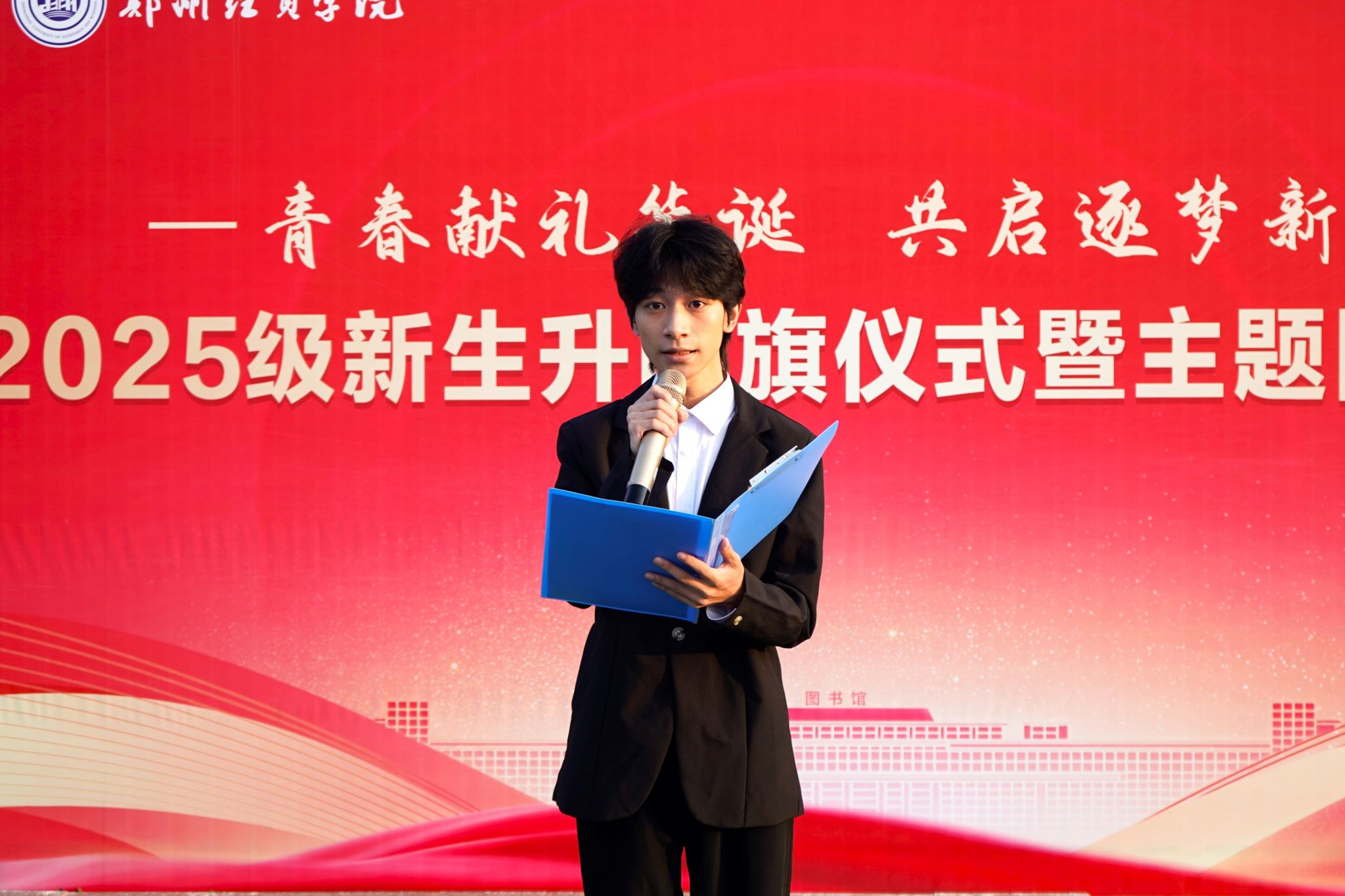国旗下,老生代表商学院唐中奎向加入郑州经贸学院的全体新同学表示热烈的欢迎。他结合自身在校学习生活经历,分享了在专业学习、实践活动中的成长感悟,鼓励新生们珍惜大学时光,以勤奋求知夯实基础,以开阔视野拥抱未来,在郑州经贸学院的平台上追逐梦想、不负韶华,以实际行动为祖国发展贡献青春力量。