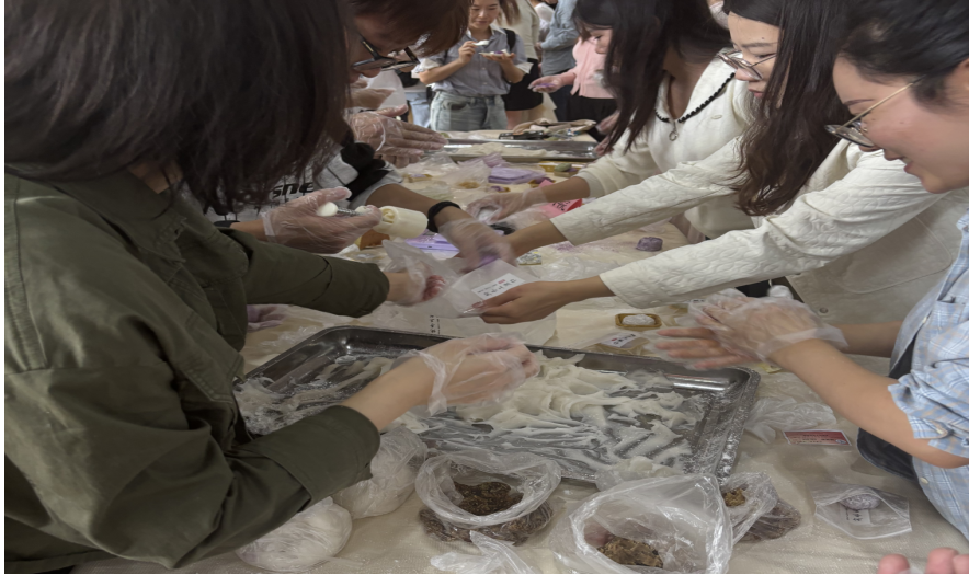 随后中秋月饼DIY环节正式启动。活动现场备齐冰皮预拌粉、低糖馅料、古风雕花模具等全套材料,会计学院教师李盈现场示范指导。教职工们兴致勃勃地围在一起,揉面团、包馅料、压模具,亲手制作独具特色的中秋月饼。从经典的莲蓉、豆沙馅,到创新的芋泥、芝士馅,一个个造型精致的月饼在指尖诞生,大家将做好的月饼装入定制包装袋,准备带给家人分享这份“指尖上的团圆”。活动最后是激动人心的抽奖环节。本次活动设一等奖2名、二等奖6名、三等奖12名,一等奖获得者还现场送上了双节祝福,真挚的话语让现场氛围愈发温馨。