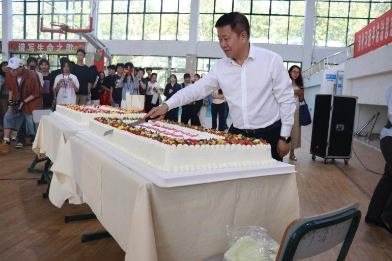 舞狮表演结束后,国庆蛋糕分享环节温情开启。工作人员推入场内的两份定制蛋糕格外引人注目,一份印有“厚德博学,求是创新”的校训,彰显学校办学初心;另一份书写“中秋揽月贺国庆,经贸同心谱新程”,传递双节同庆的美好寓意。在场教职工有序领取蛋糕,在品尝甜蜜的同时,共庆祖国生日,感受学校大家庭的温暖。