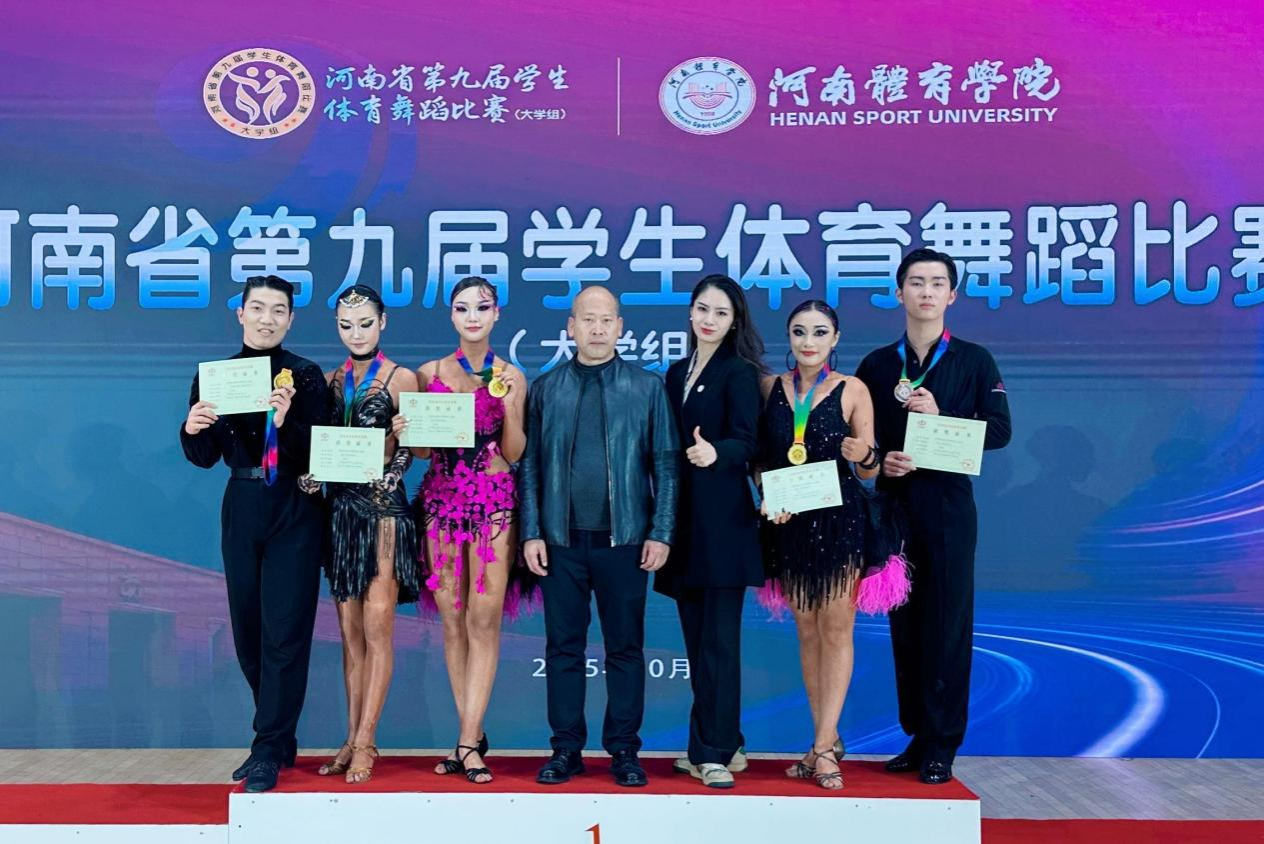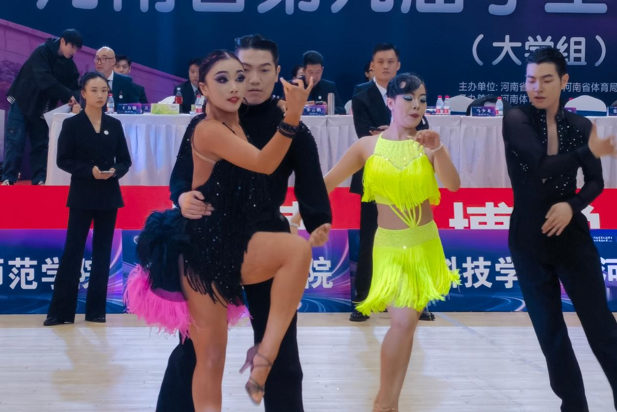 10 月 17 日上午,河南省第九届学生体育舞蹈比赛(大学组)在河南体育学院综合训练馆正式拉开帷幕。本次赛事汇聚全省 43 所高校的近 900 名运动员参赛,涵盖拉丁舞、标准舞等多个项目的激烈角逐。我校选派通识教育学院副院长田造轩担任领队,体育部教师崔艺展出任教练员的专业教练团队,带领5名运动员代表学校出征,开启我校在体育舞蹈赛事领域的全新尝试。