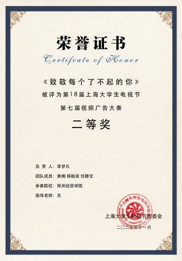 本届大赛竞争激烈,共吸引全国47所高校的333件作品参赛。由李梦凡、黄楠、杨贻宣、任静文四位同学创作的公益作品《致敬每个了不起的你》荣获二等奖;由李鑫豪、符刘翔、王成林创作的《追光者日记》以及由张续航、燕敬涛、张贝、孙雅萌创作的《以诚信为美引芳香满径》两部作品均荣获三等奖。这些作品紧扣公益主题,创意独特,制作精良,获得了评委的认可。参赛团队在张文慧、唐永勇老师的悉心指导下,圆满完成了创作与报送工作。
