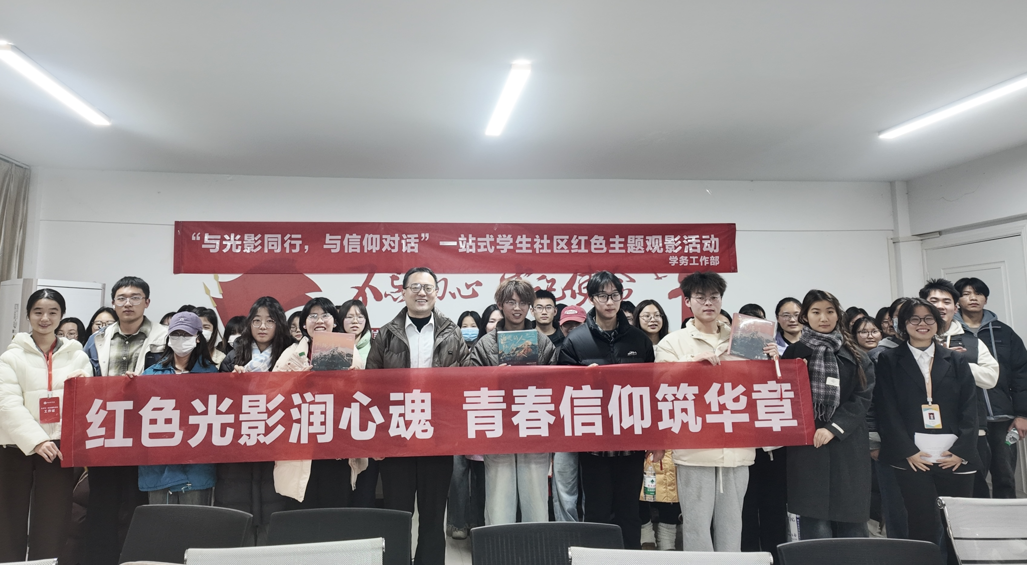 活动在集体合影中落下帷幕。此次红色观影活动不仅是一场视觉的盛宴,更是一堂生动的思政课。通过光影叙事与情感共鸣,进一步激发了同学们的爱国情怀、担当之志与奋进之力。未来,学校将持续依托“一站式”学生社区平台,推动主题教育活动常态化,让信仰之光照亮奋斗之路,让青春之歌在时代征程中昂扬绽放。