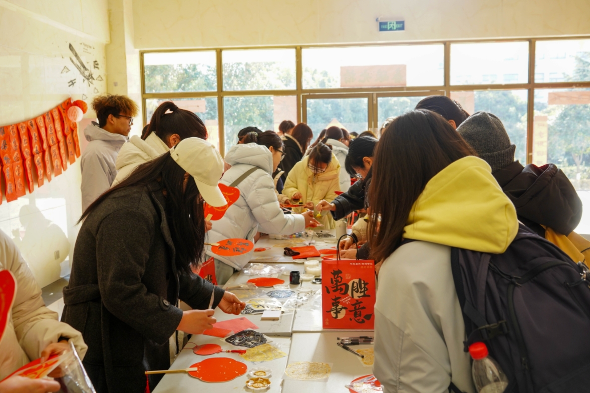 活动现场热闹非凡,师生们纷纷挑选自己喜爱的春联内容,或请书法协会的同学们量身定制,拿到写满墨香的春联时,脸上都洋溢着幸福的笑容。不少师生表示,手写春联比印刷春联更有温度、更有意义,不仅感受到了传统文化的魅力,更收获了一份来自学校的温暖祝福。现场还设置了纸扇涂鸦环节,同学们纷纷动手在纸扇上拓印下一个又一个“福”字,传递着辞旧迎新、福气满满的美好愿景。