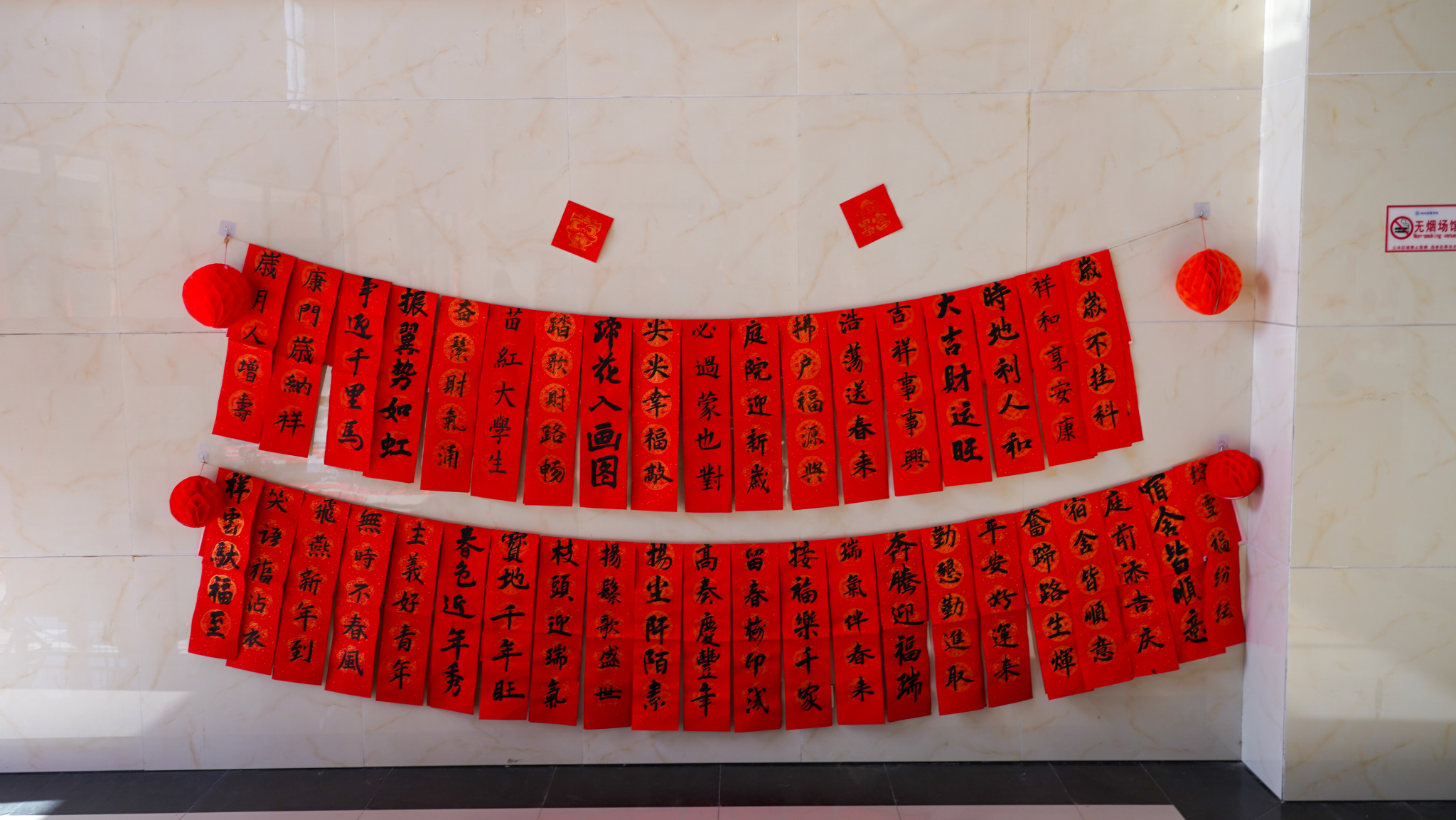 活动现场布置得格外温馨,鲜红的春联纸整齐摆放,笔墨砚台一应俱全,浓厚的节日氛围扑面而来。书法协会的同学们挥毫泼墨,笔走龙蛇间,一幅幅笔力遒劲、寓意吉祥的春联跃然纸上。“一元复始山河秀,万象更新锦绣春”“紫气东来春得意,青云直上马扬蹄”“百花齐放春光好,万马奔腾气象新”,无论是饱含美好期许的新年贺词,还是激励奋进的励志佳句,都承载着浓浓的祝福,展现出新时代青年对传统文化的喜爱与传承。