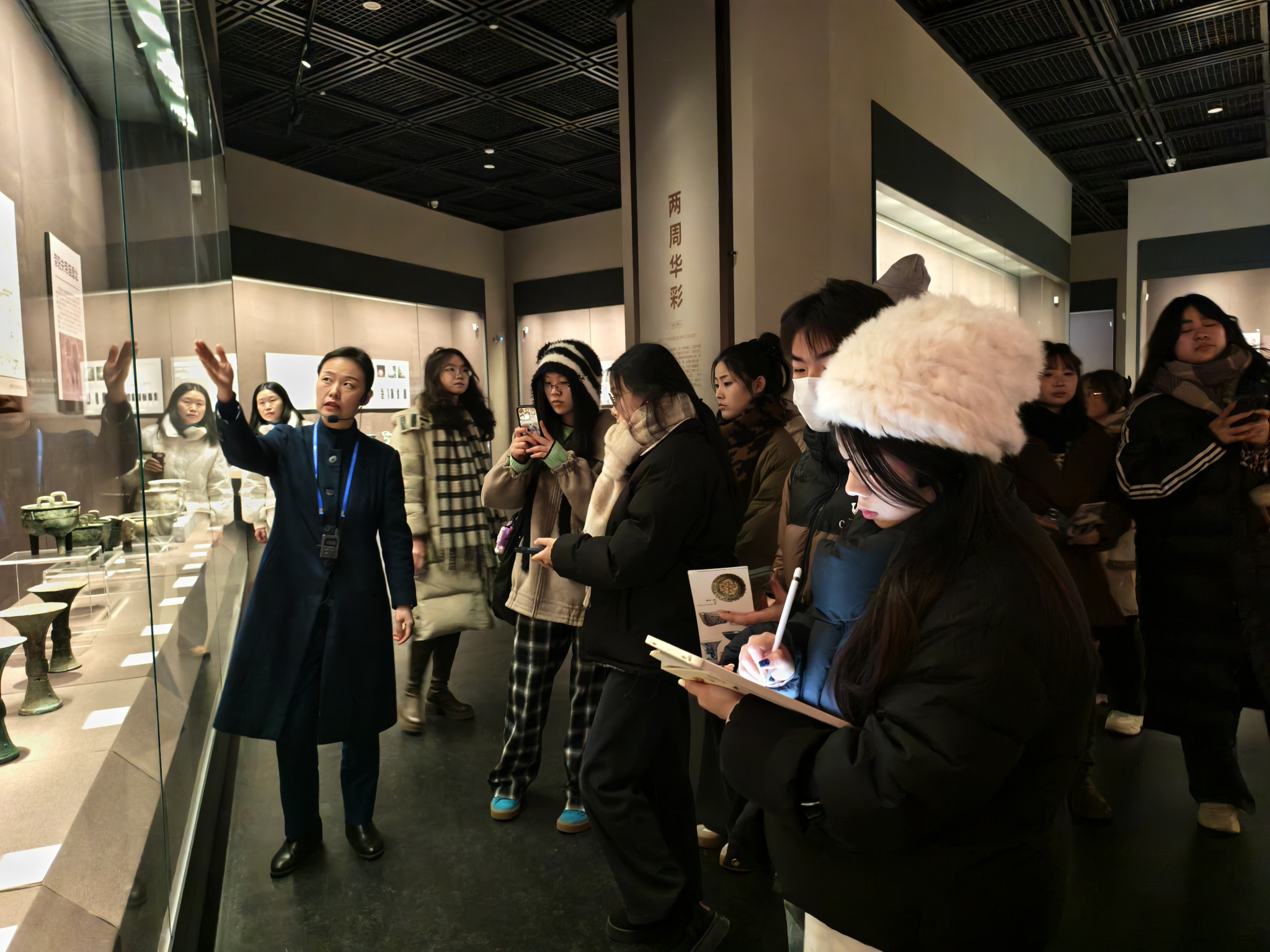 郑州博物馆新馆以“黄龙聚宝,物博盛天”为设计理念,建筑造型彰显“中华之中、华夏之冠”的文化气质。馆内设有21个展厅,汇聚二十余类珍贵文物,全面展现中原地区深厚的历史文脉。研学首站,师生来到二层核心展厅“创世王都”,在专业讲解的导览下,系统梳理了从史前到夏商周时期郑州地区的文明发展轨迹。展厅陈列的商代兽面纹铜方鼎等千余件文物,其纹饰与工艺细节生动展现了先民造物智慧,也为探究传统服饰的材质沿革与审美起源提供了鲜活实证。