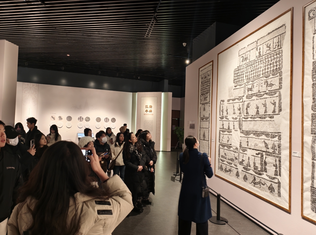 专题展区部分,汉画像砖与传统云肩成为本次研学的重点。师生先后参观了位于三层的“天工石影”“汉诗意韵”展厅,深入学习汉画像砖的历史脉络与拓印技艺,领会其“以刀代笔”记录汉代生活的艺术表达。随后步入四层的“锦绣云霞”展厅,集中观摩晚清至民国时期的云肩藏品。这些以织锦缎为材,融绣、镶、嵌等工艺于一体的服饰珍品,纹样多取云纹四合、花鸟呈祥之意,既体现“外圆内方”的传统造物哲学,也寄托了古人对美好生活的向往,使学生直观感受到传统服饰实用与审美并重的文化特质。此外,师生还参观了馆藏石刻、陶瓷等专题展览,从中多角度捕捉中原美学的基因片段。