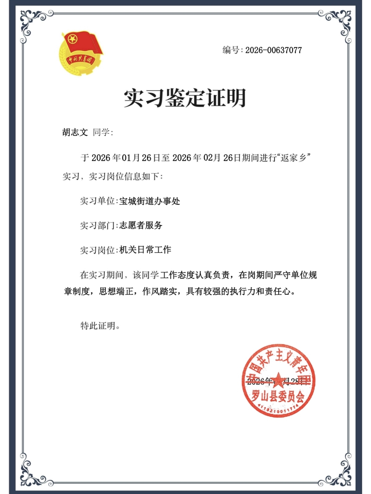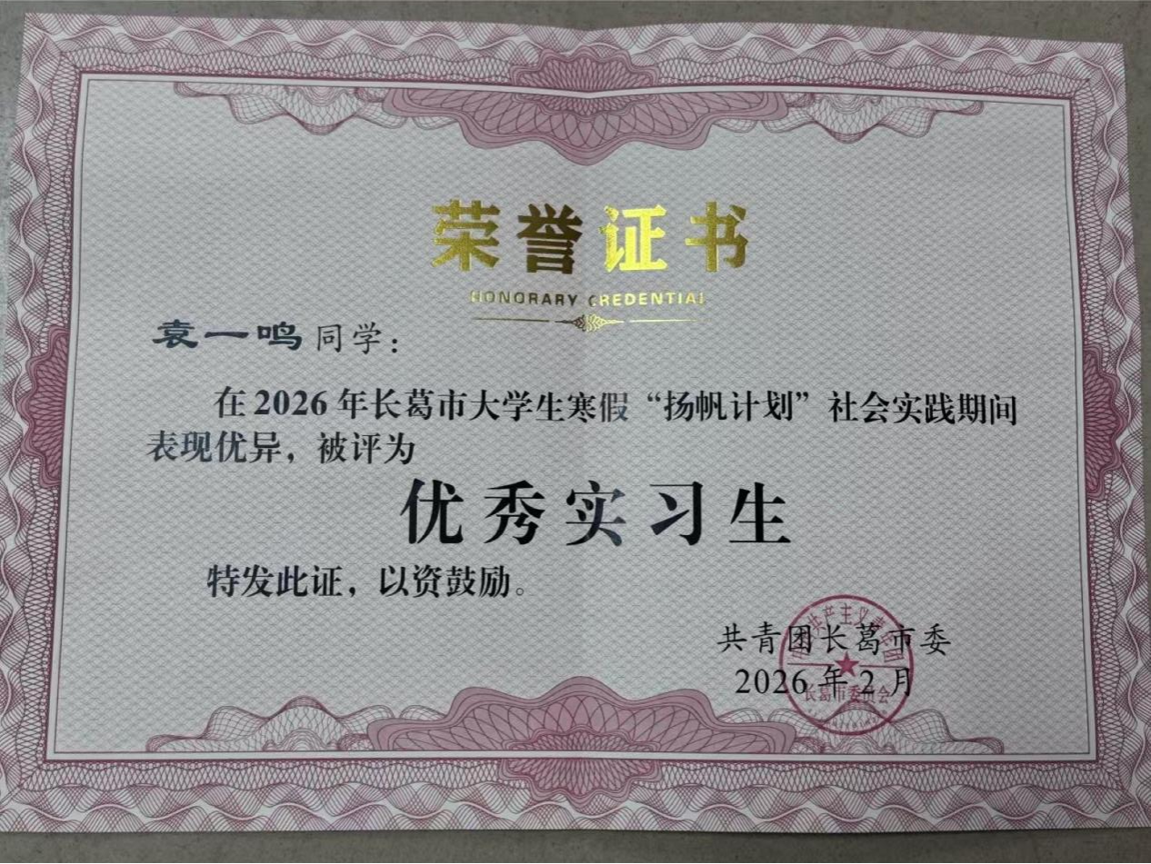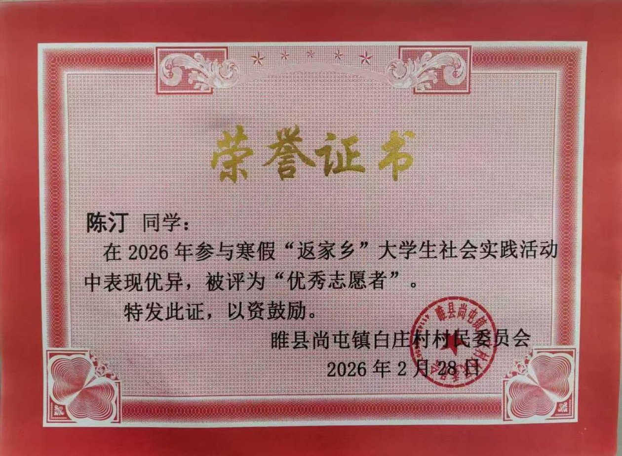 大数据与人工智能学院赵孟博同学寒假期间参与白寺镇人民政府党政办公室社会实践。坚守值班岗位、做好来访接待与文件整理,认真接听政务来电、精准记录内容并及时传达指令;全力负责蓝天卫士监管平台运维,盯守辖区10个村庄监控,严密巡查烟花燃放、秸秆燃烧等情况并第一时间上报;主动学习基层党务知识与办公规范,协助整理党建资料,在基层政务一线锤炼本领、担当作为。