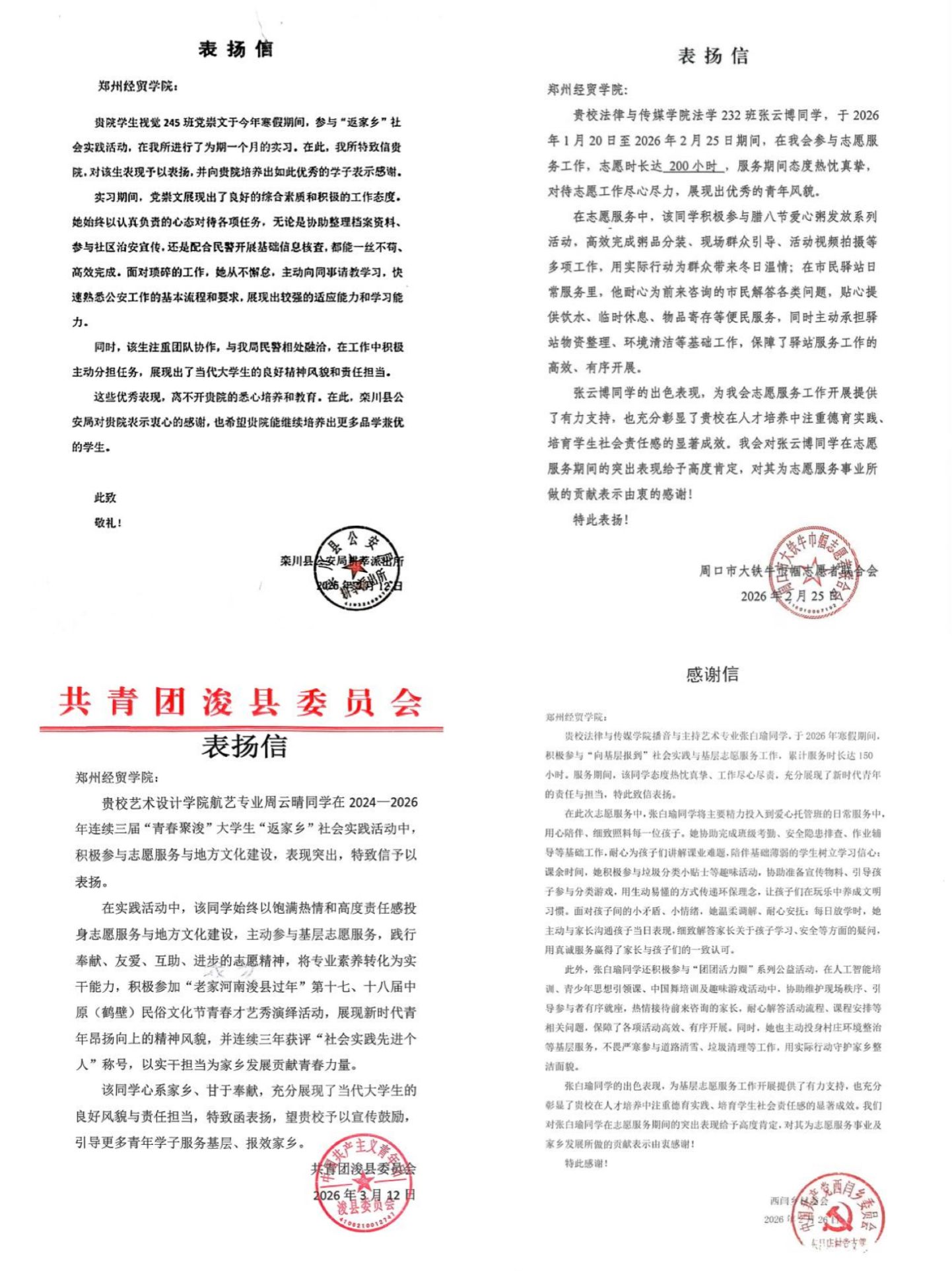 我校学生荣获实践单位颁发的荣誉证书、表扬信(部分展示)