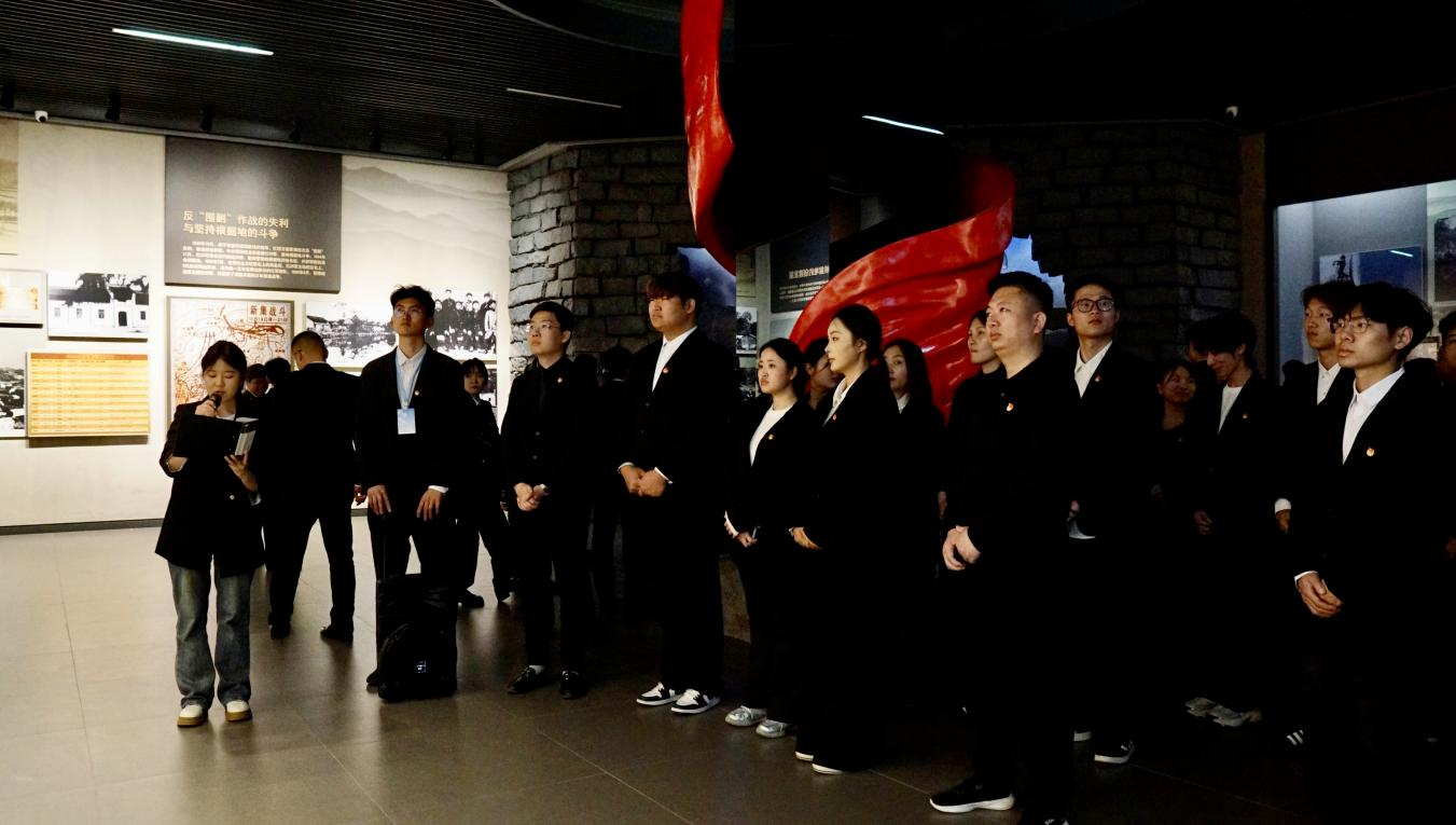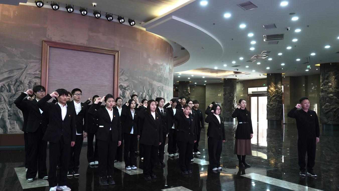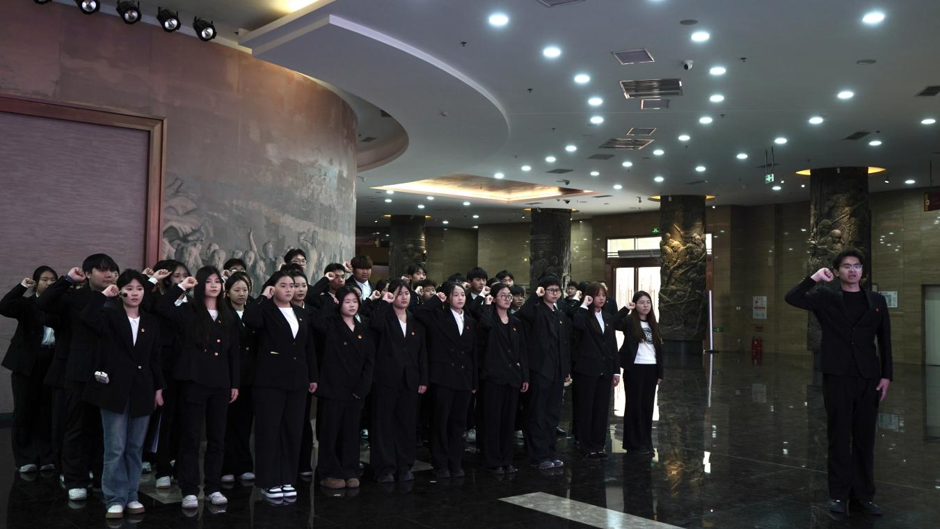 随后,全体人员在讲解员播音242班李昱璇同学的带领下参观国防教育馆和中原英烈纪念馆,在沉浸式学习中进一步加深对革命历史的理解与认识。在纪念馆中,党员师生在校团委刘欢老师的领誓下重温入党誓词,铮铮誓言坚定理想信念;团员学生在“青马班”学员代表、商学院李昭男同学的领誓下重温入团誓词,表达了赓续红色血脉、勇担时代使命的坚定决心。