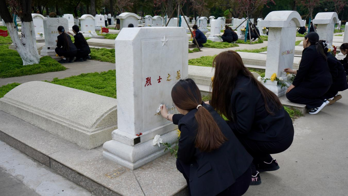全体师生敬献鲜花、擦拭墓碑